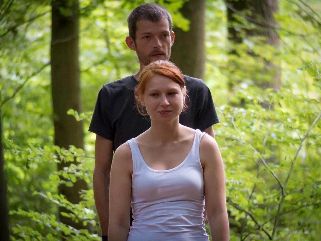 Zwei Personen stehen in einem Wald und zeigen eine Interaktion