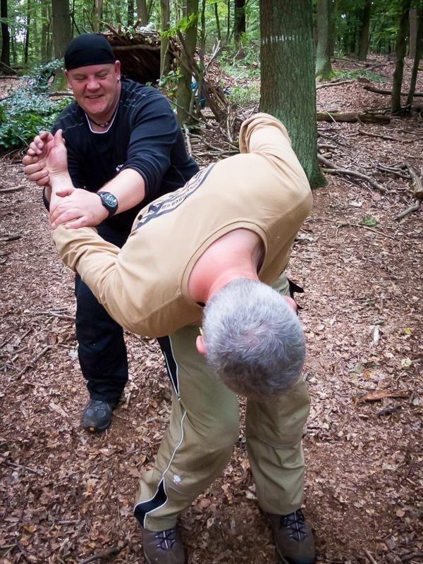 Zwei Personen üben eine Technik im Wald, eine Person hält einen Arm in einer bestimmten Position