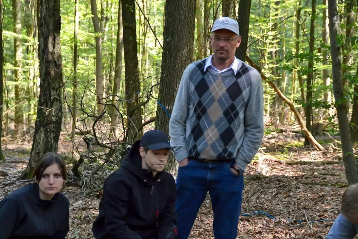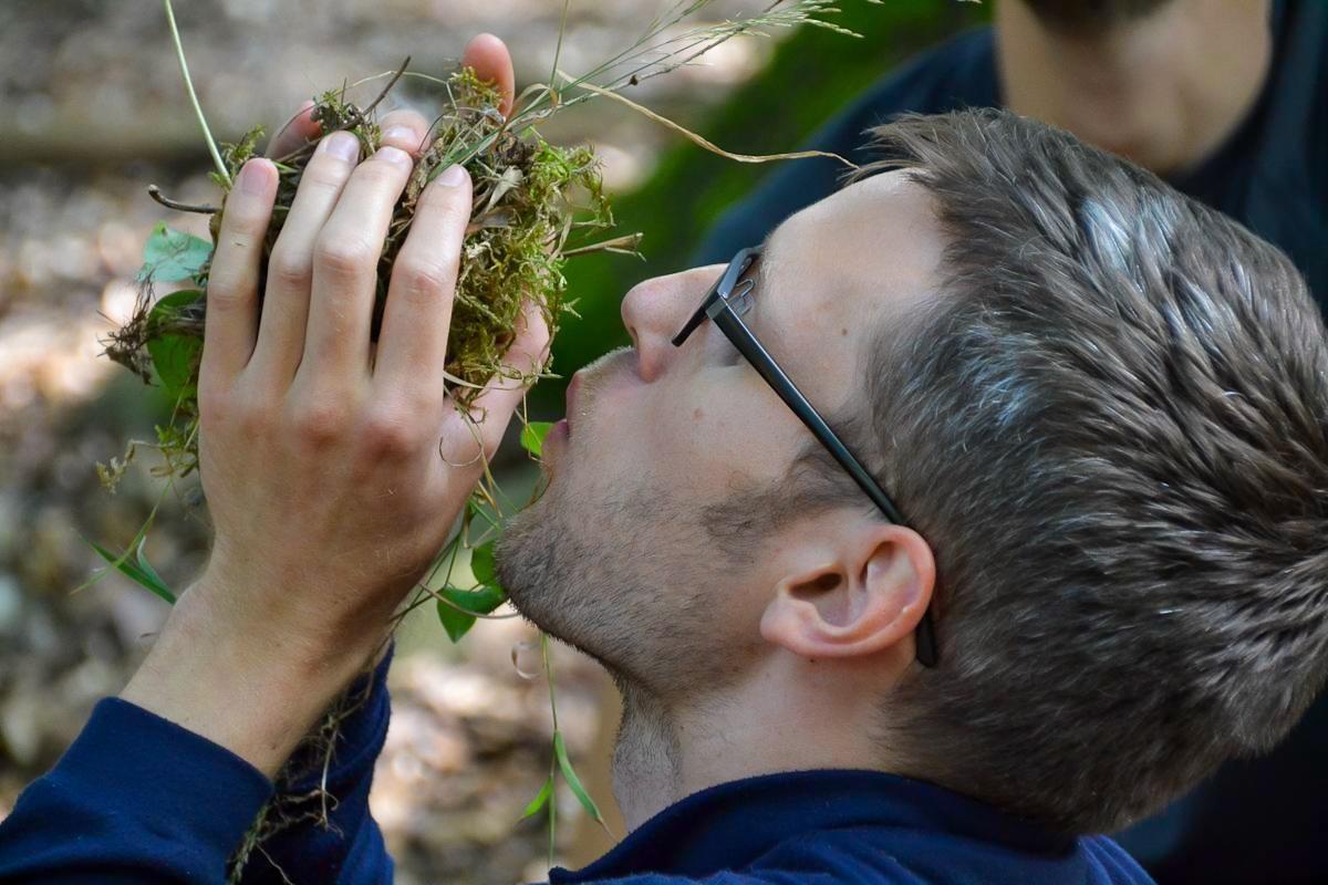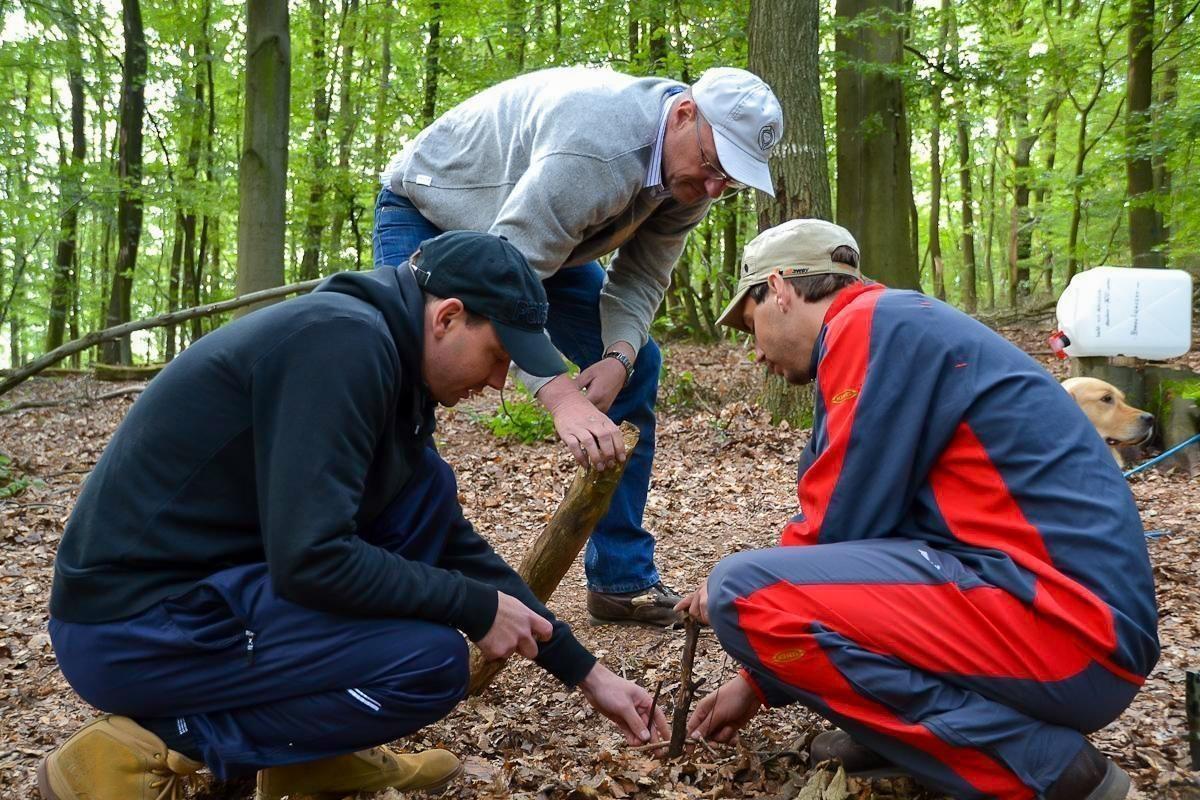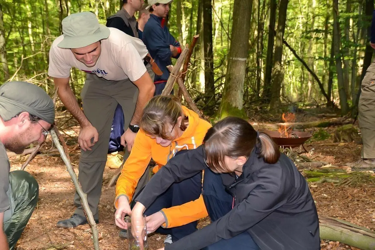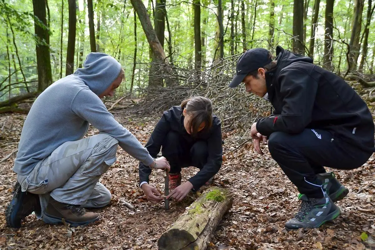 Zwei Personen führen eine Demonstration im Wald durch, während Zuschauer aufmerksam zuschauen