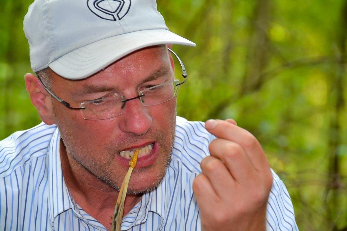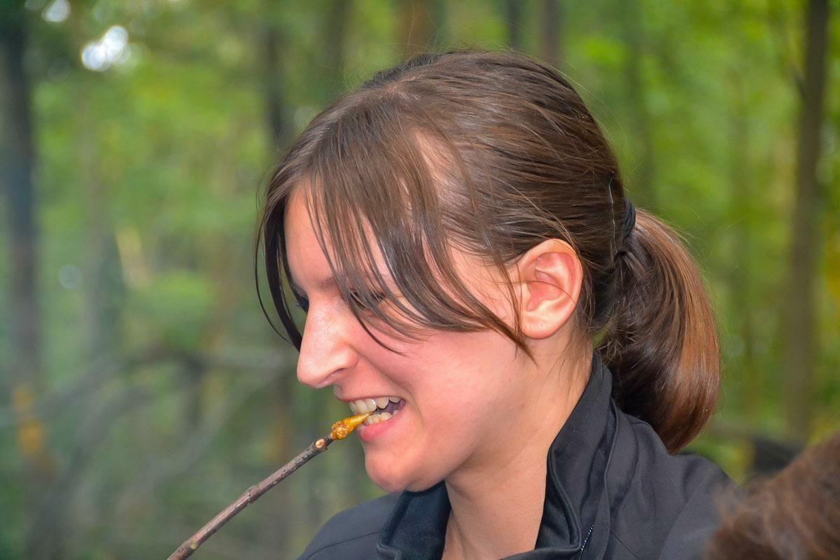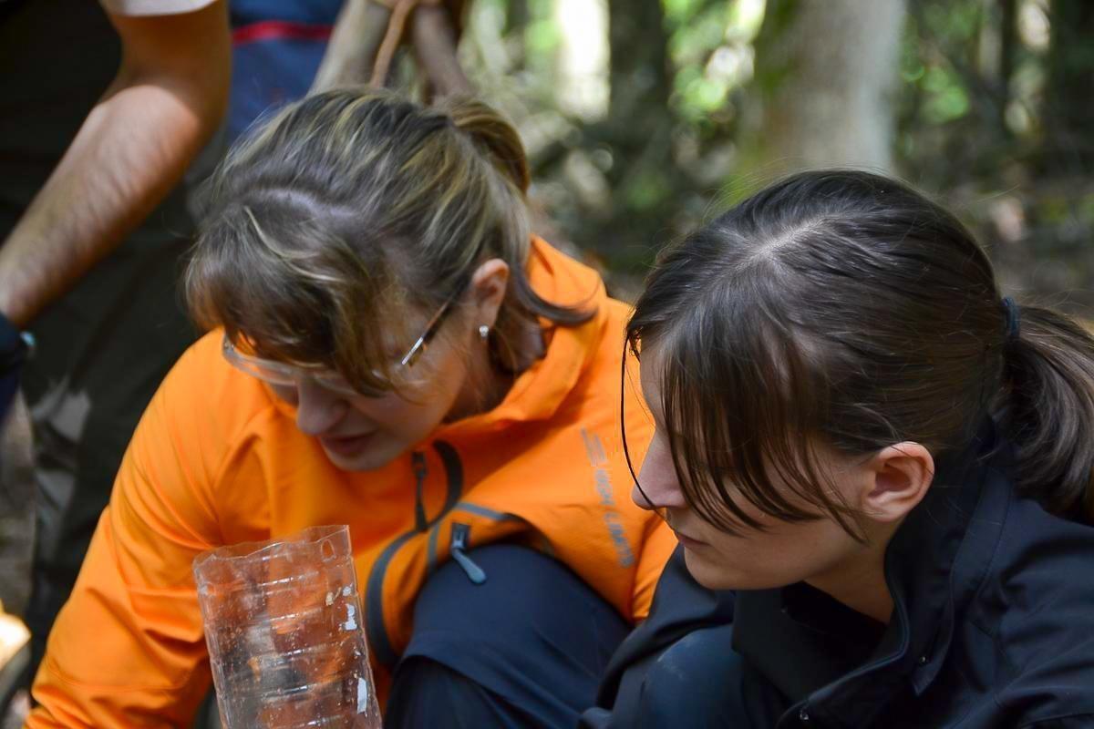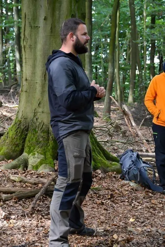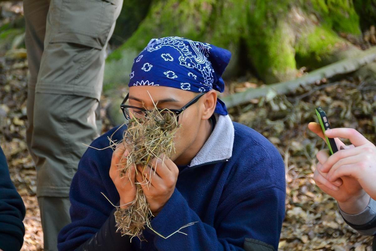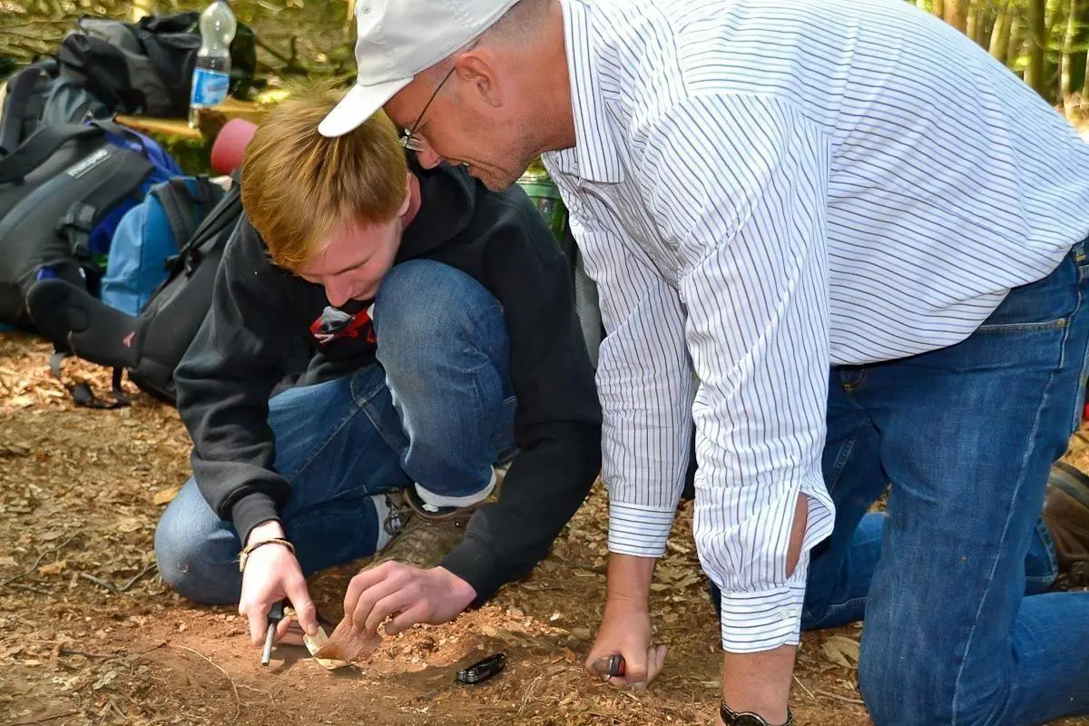 Zwei Personen führen eine Demonstration im Wald durch, während Zuschauer aufmerksam zuschauen