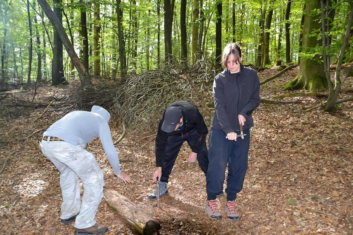 Drei Personen arbeiten am Boden mit Holzstücken im Wald