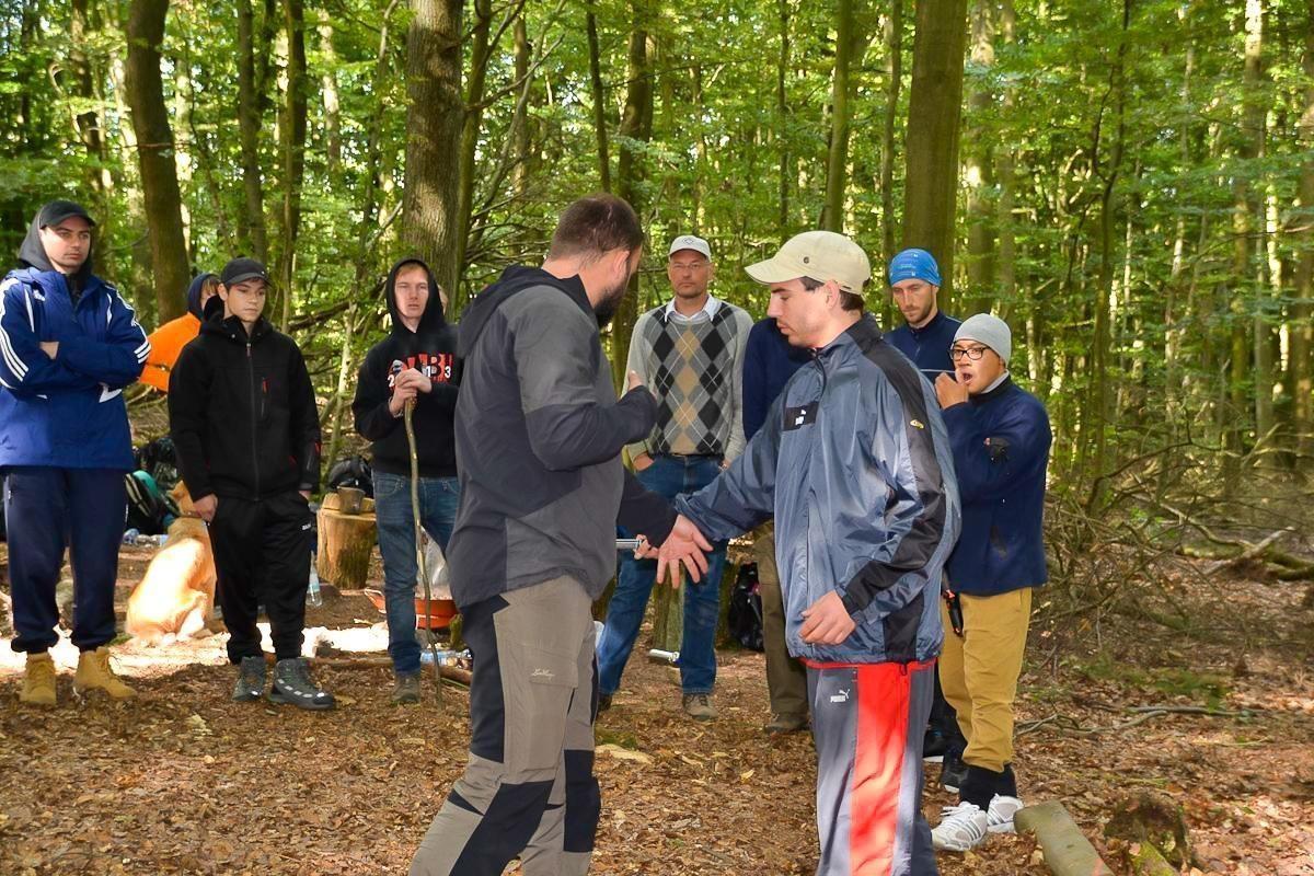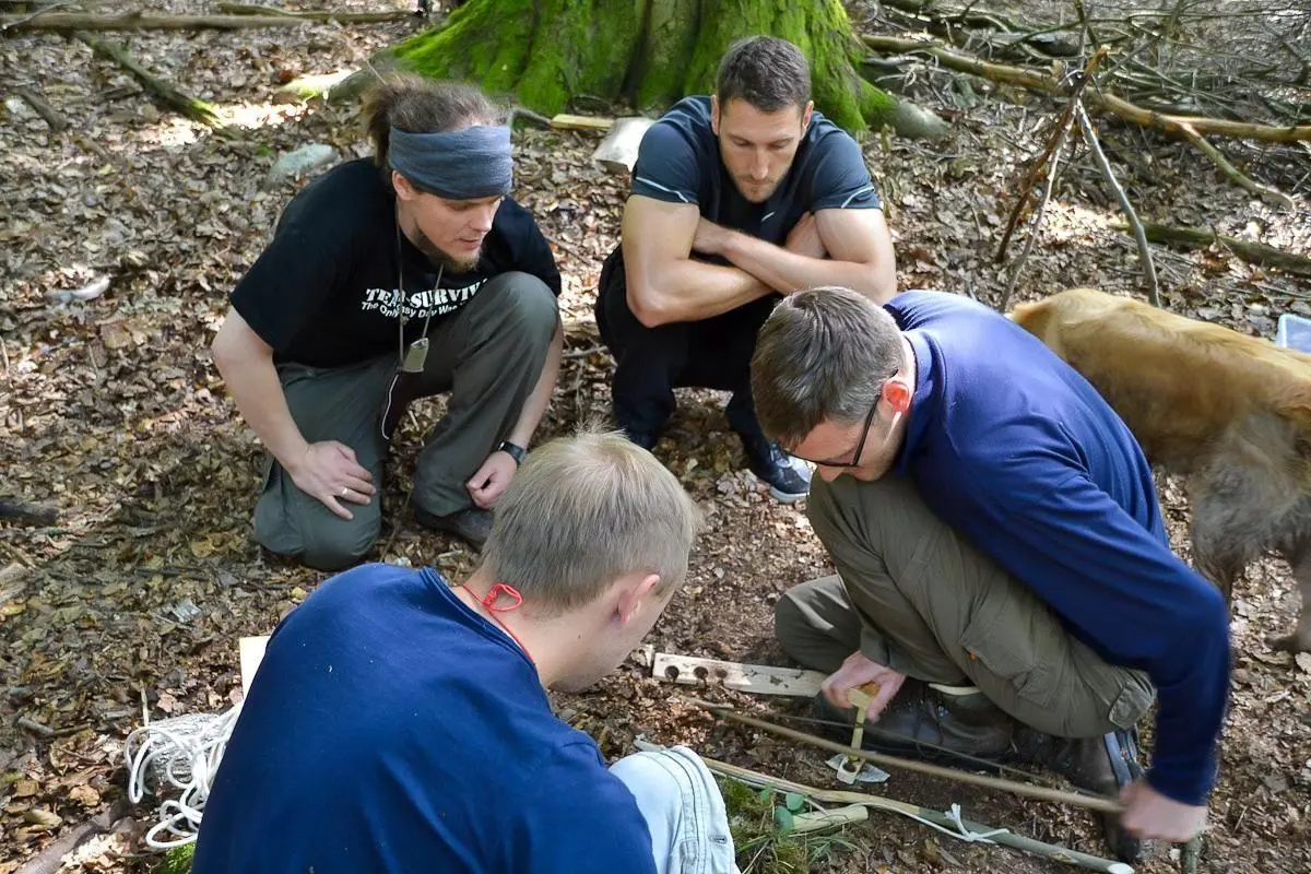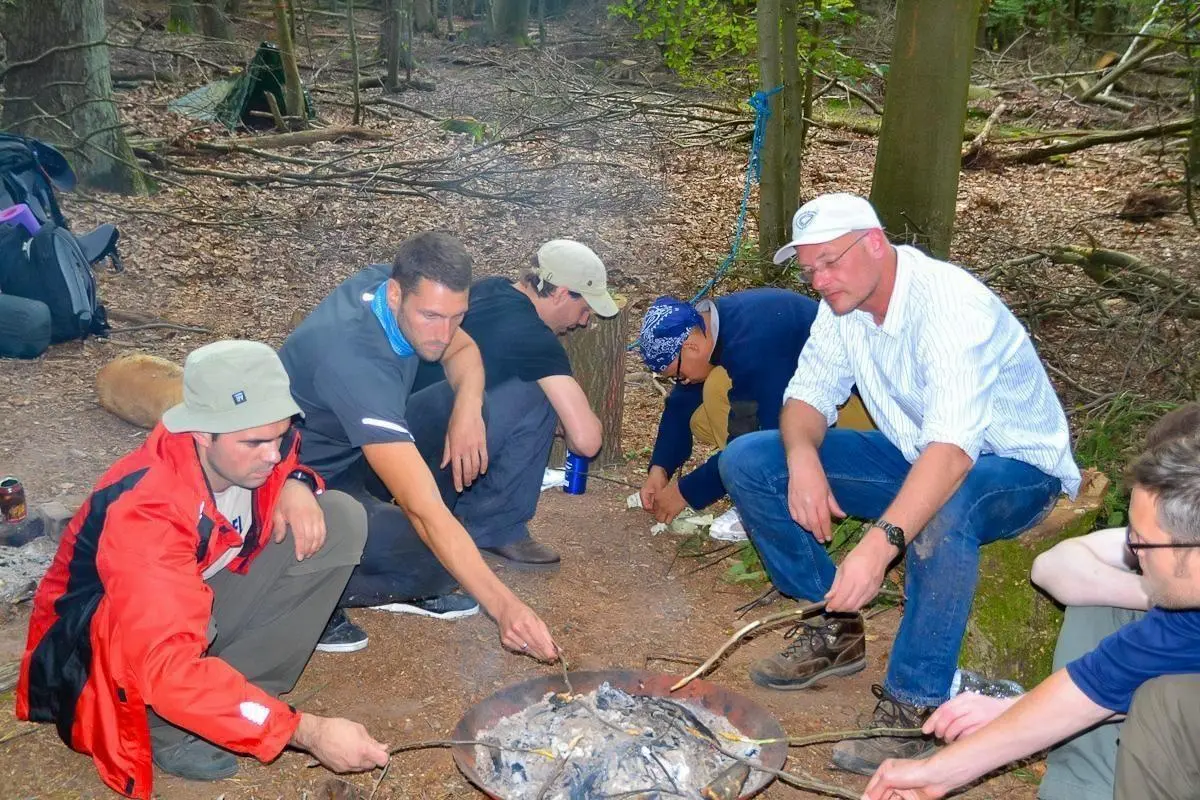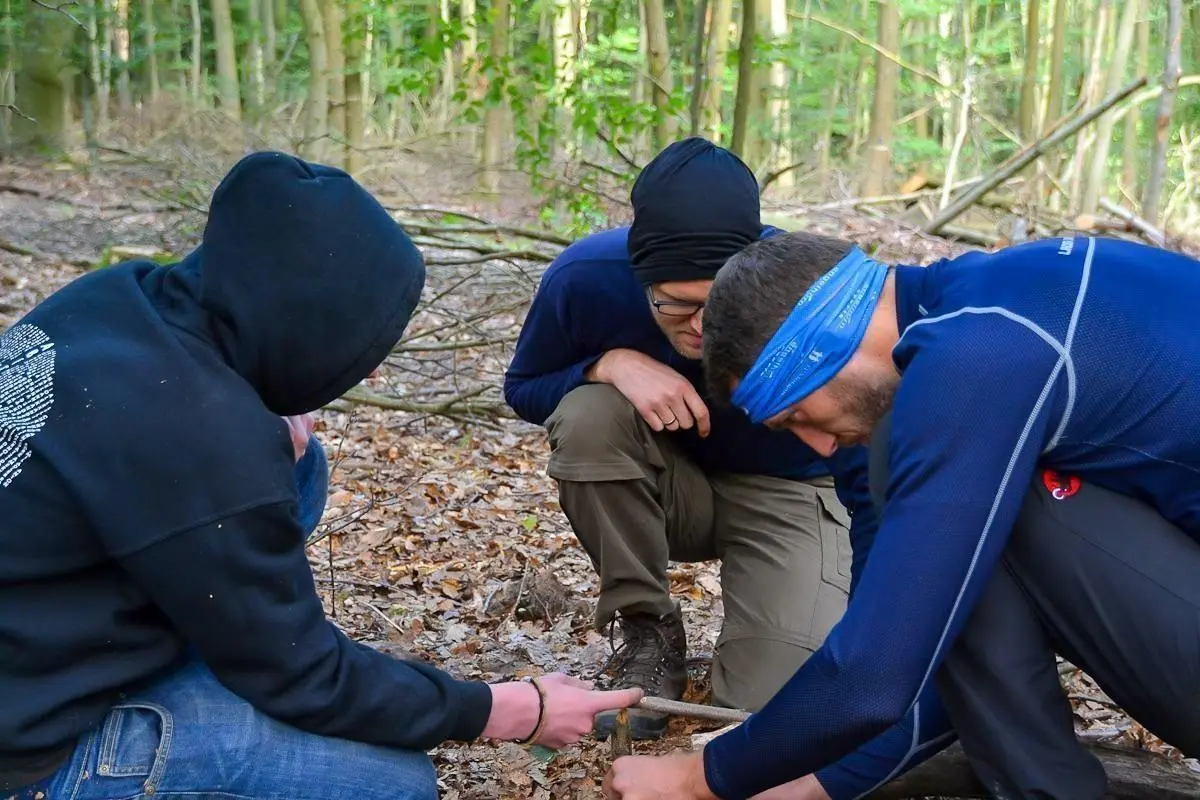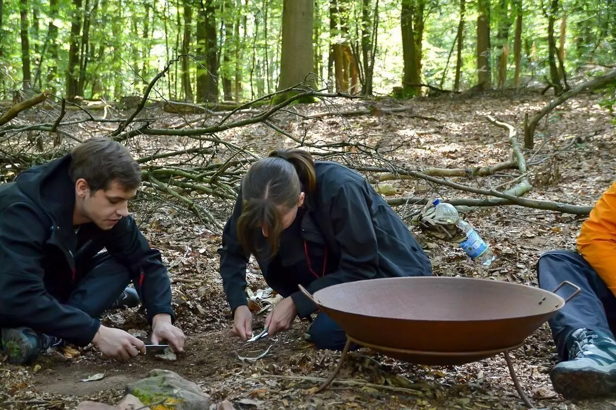 Die Teilnehmer bauten gemeinsam einfache Fallen im Wald, um sich mit dem Fallenbau vertraut zu machen. Diese Technik ist essenziell, um Nahrungsquellen in der Wildnis zu sichern. In Gruppen arbeiteten die Teilnehmer auch an der Feuererzeugung. Sie übten das Feuermachen und bereiteten eine Feuerstelle vor, um ihre Kochfähigkeiten zu demonstrieren. Dabei wurden verschiedene Kochgeräte improvisiert, um Lebensmittel über dem offenen Feuer zuzubereiten.