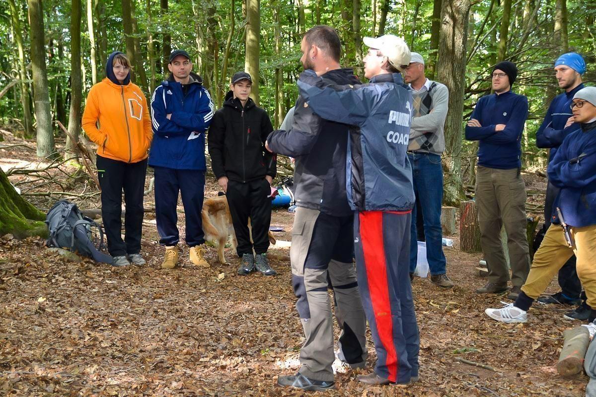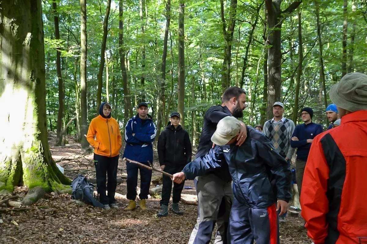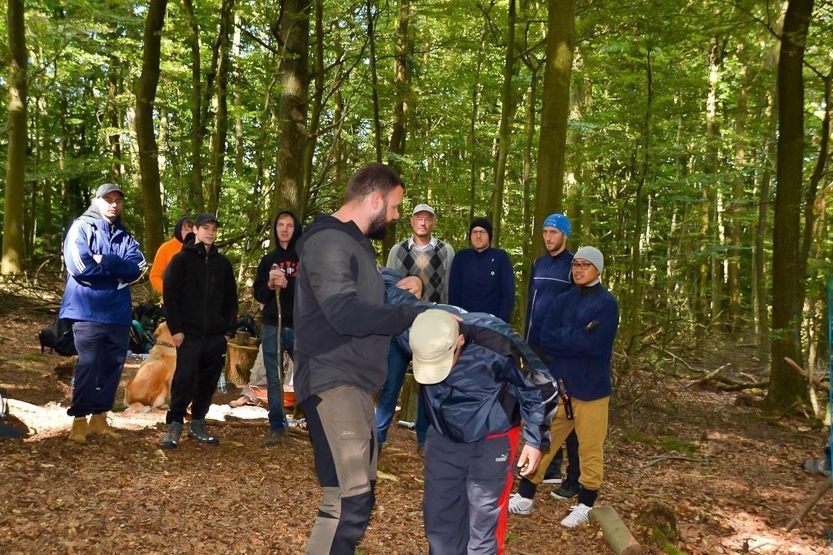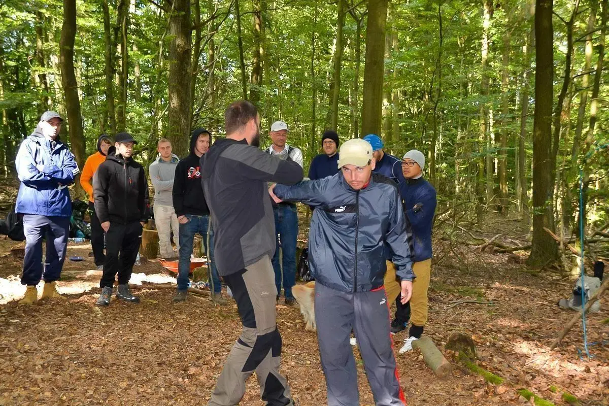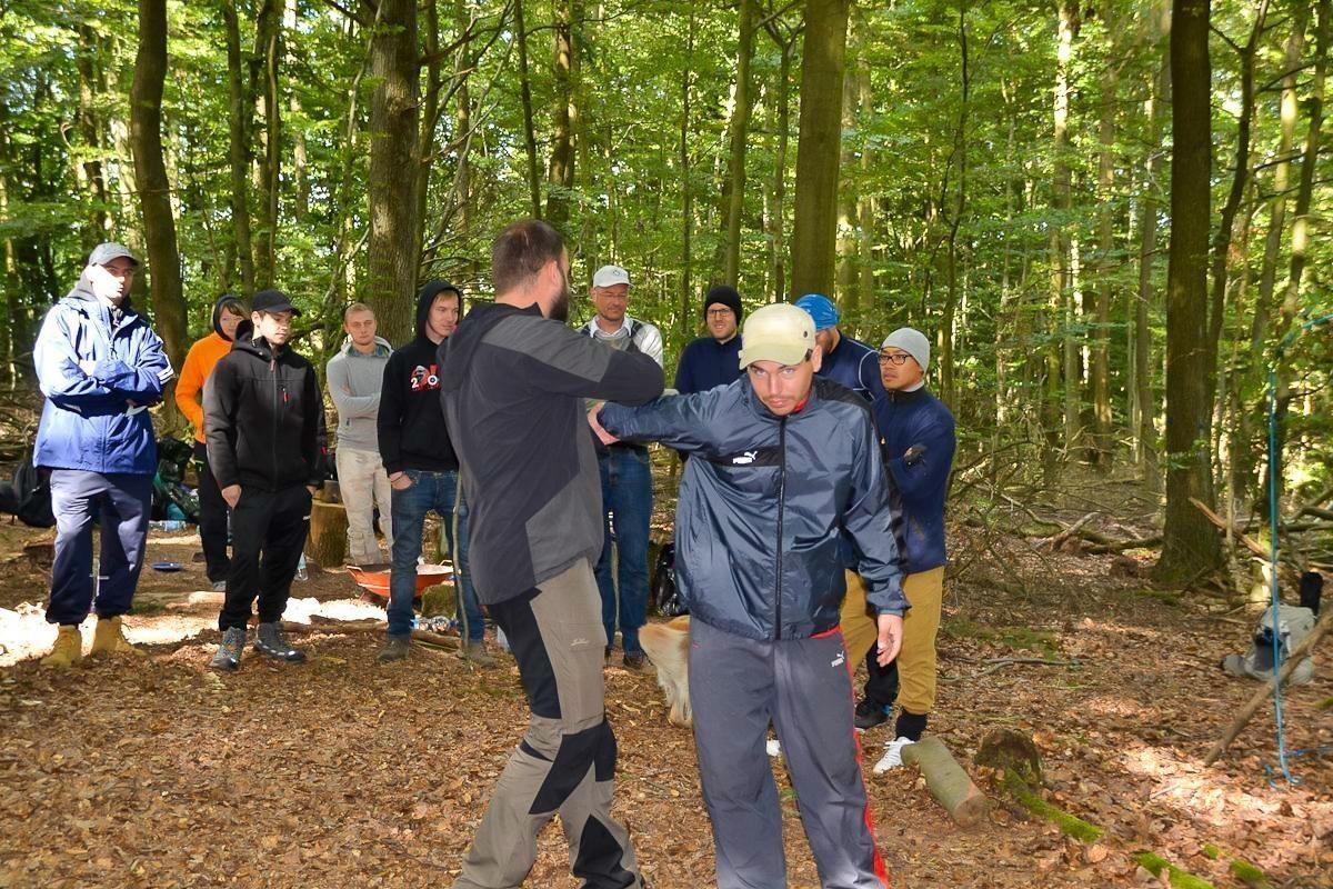 Zwei Personen demonstrieren eine Technik im Wald, Zuschauer beobachten aufmerksam
