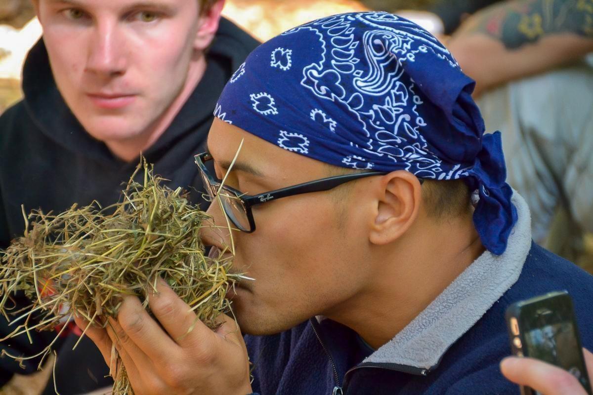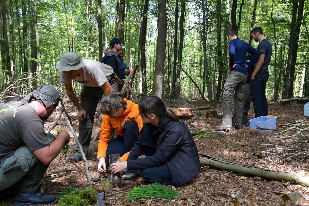 Gruppe arbeitet im Wald an verschiedenen Überlebenstechniken, einige sammeln Pflanzen