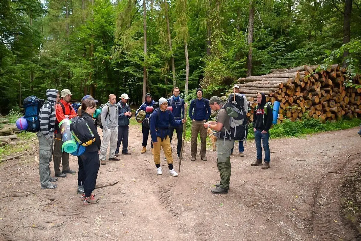 Gruppe mit Rucksäcken steht an einem Waldweg und hört einem Anleiter zu