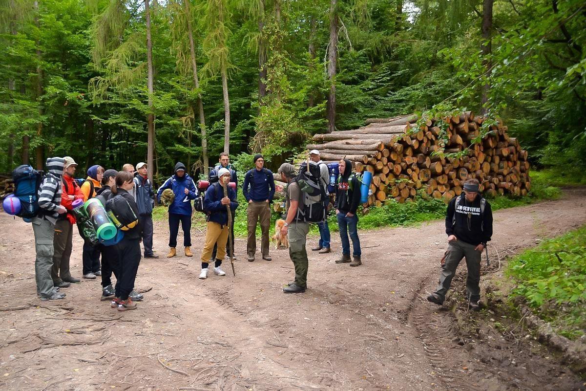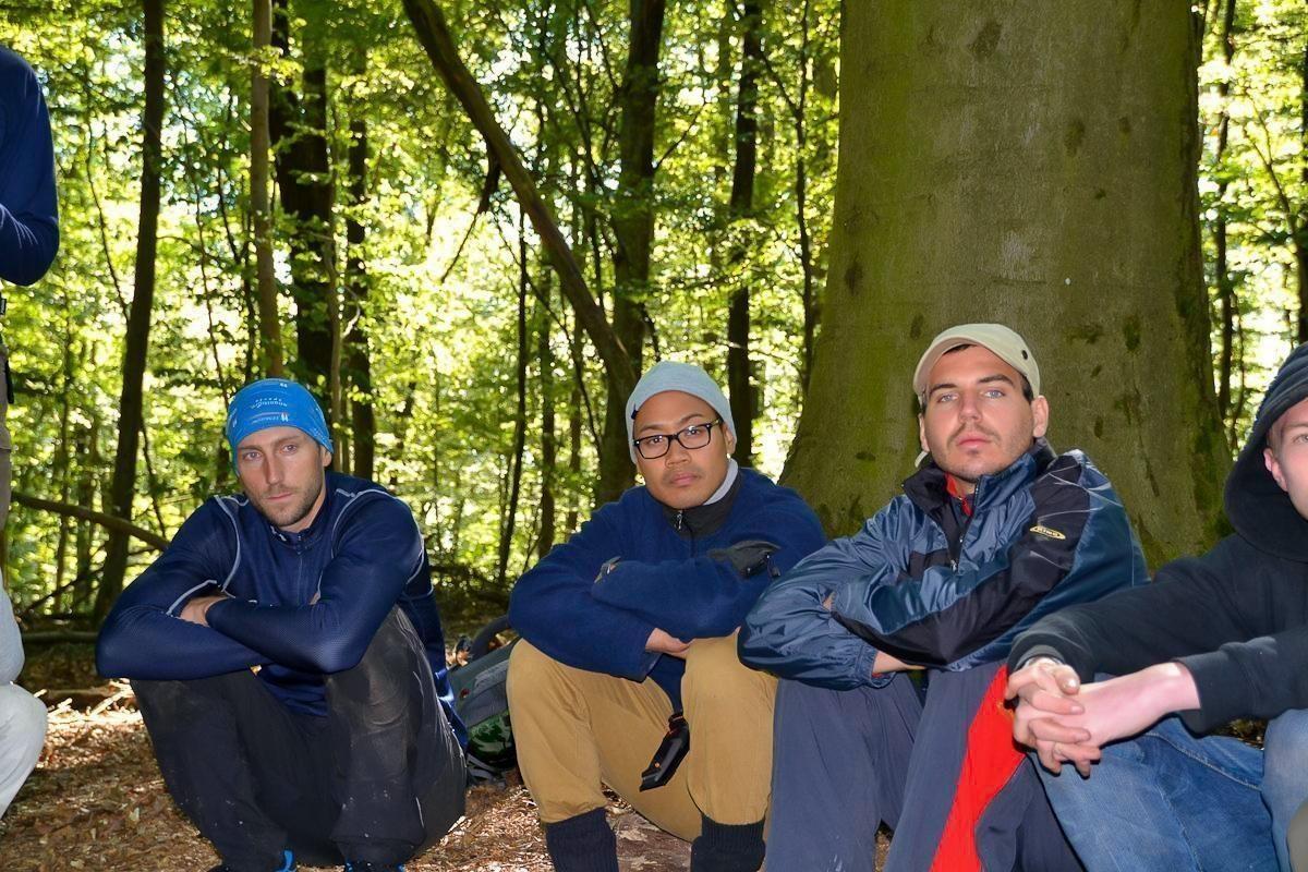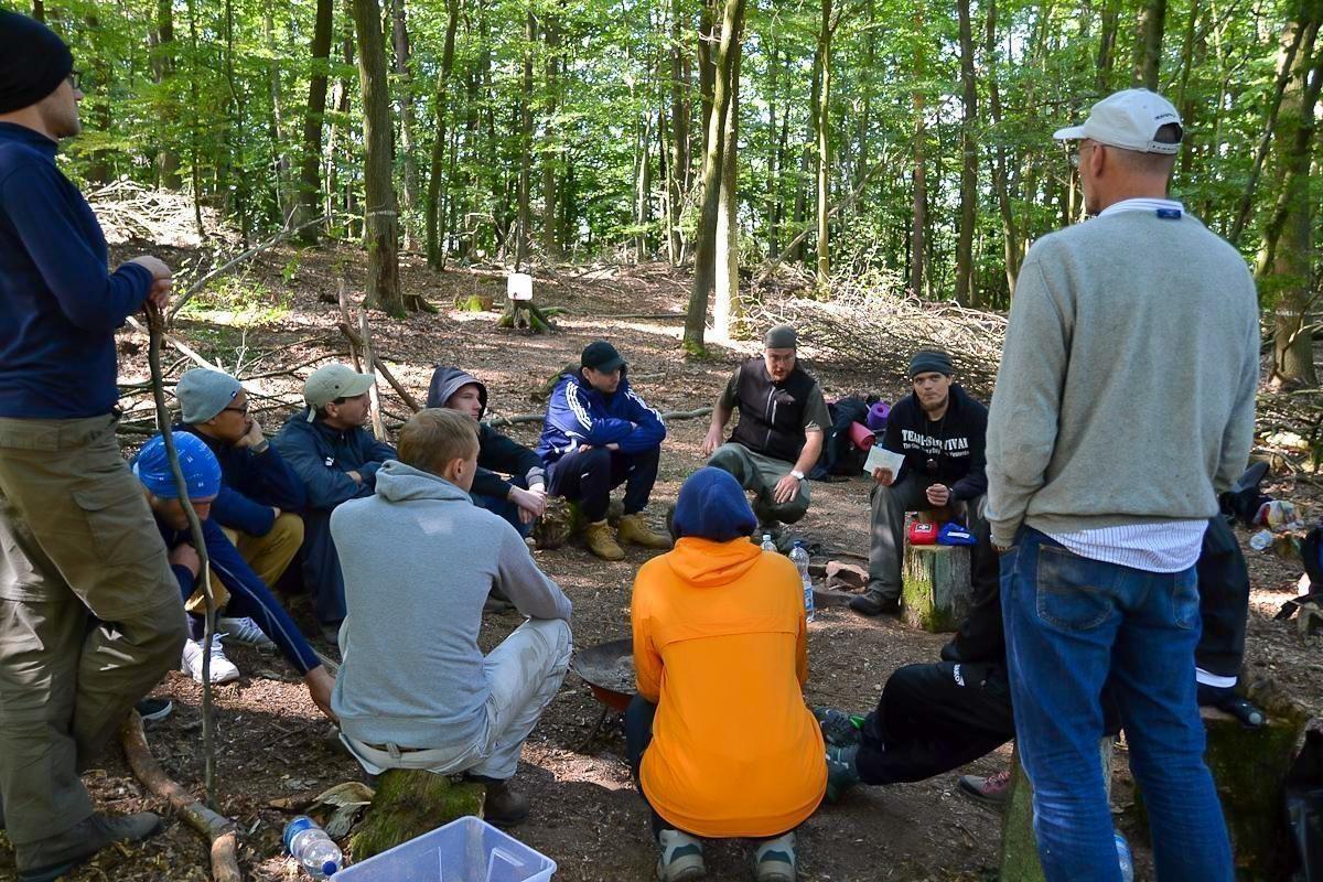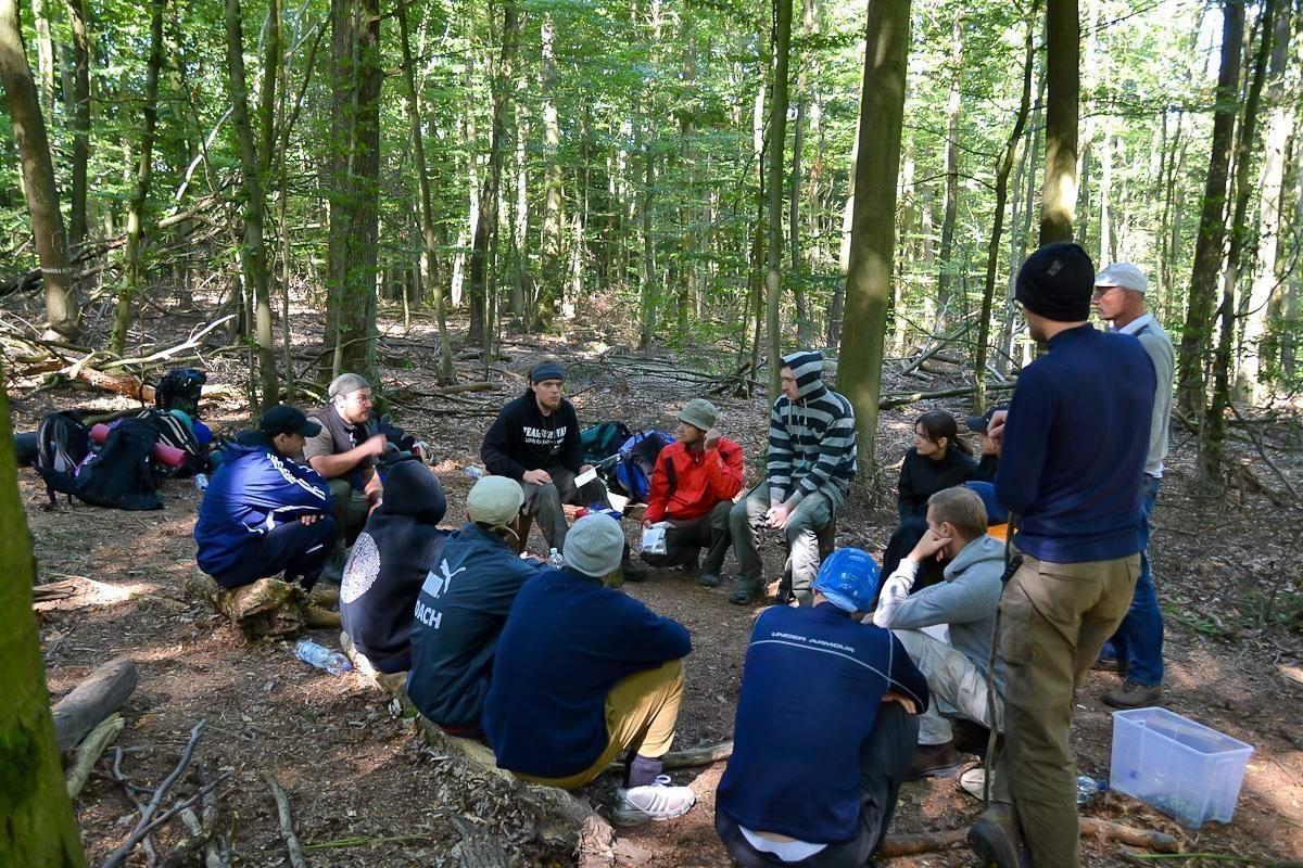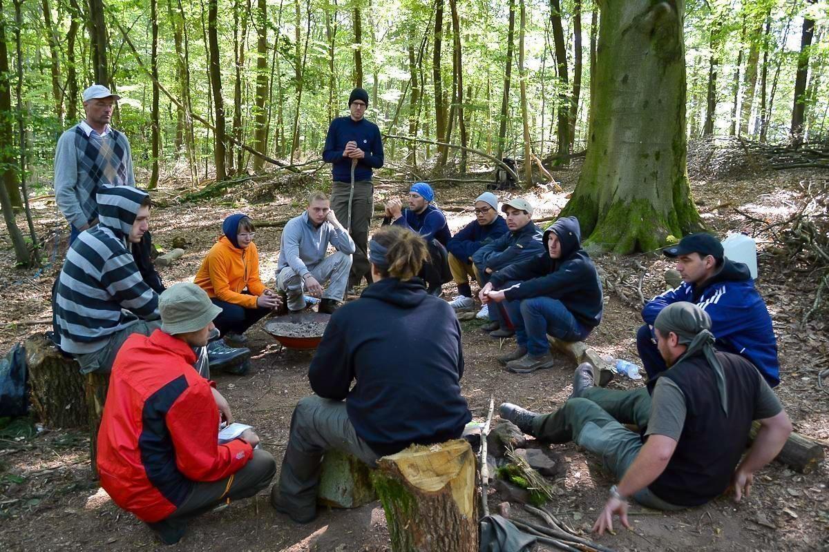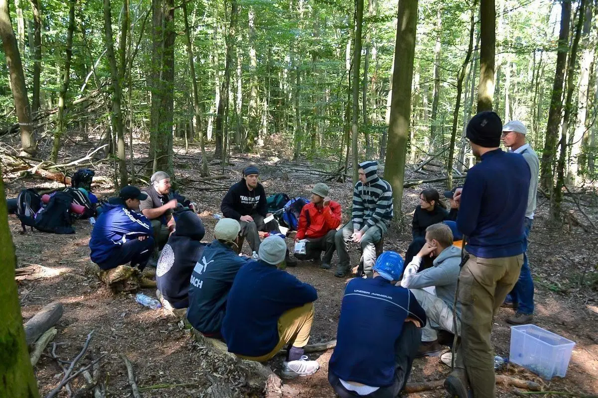 Gruppe diskutiert im Wald über Überlebenstechniken und Holzarbeit