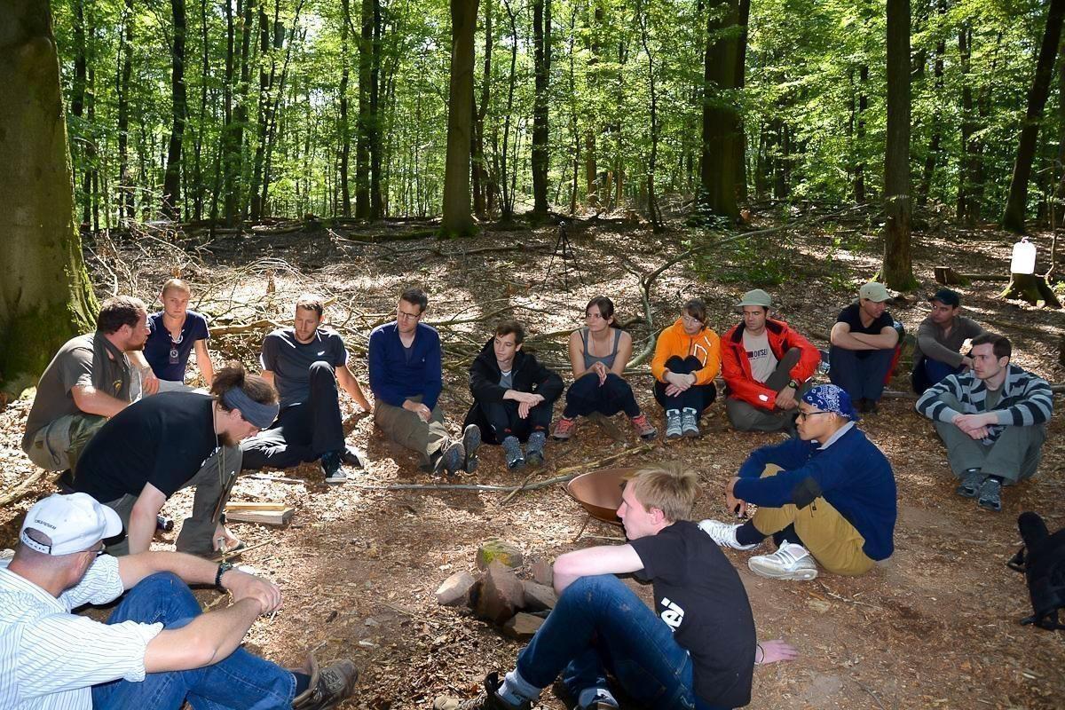 Gruppendiskussion im Wald, Teilnehmer sitzen um ein Feuerstelle