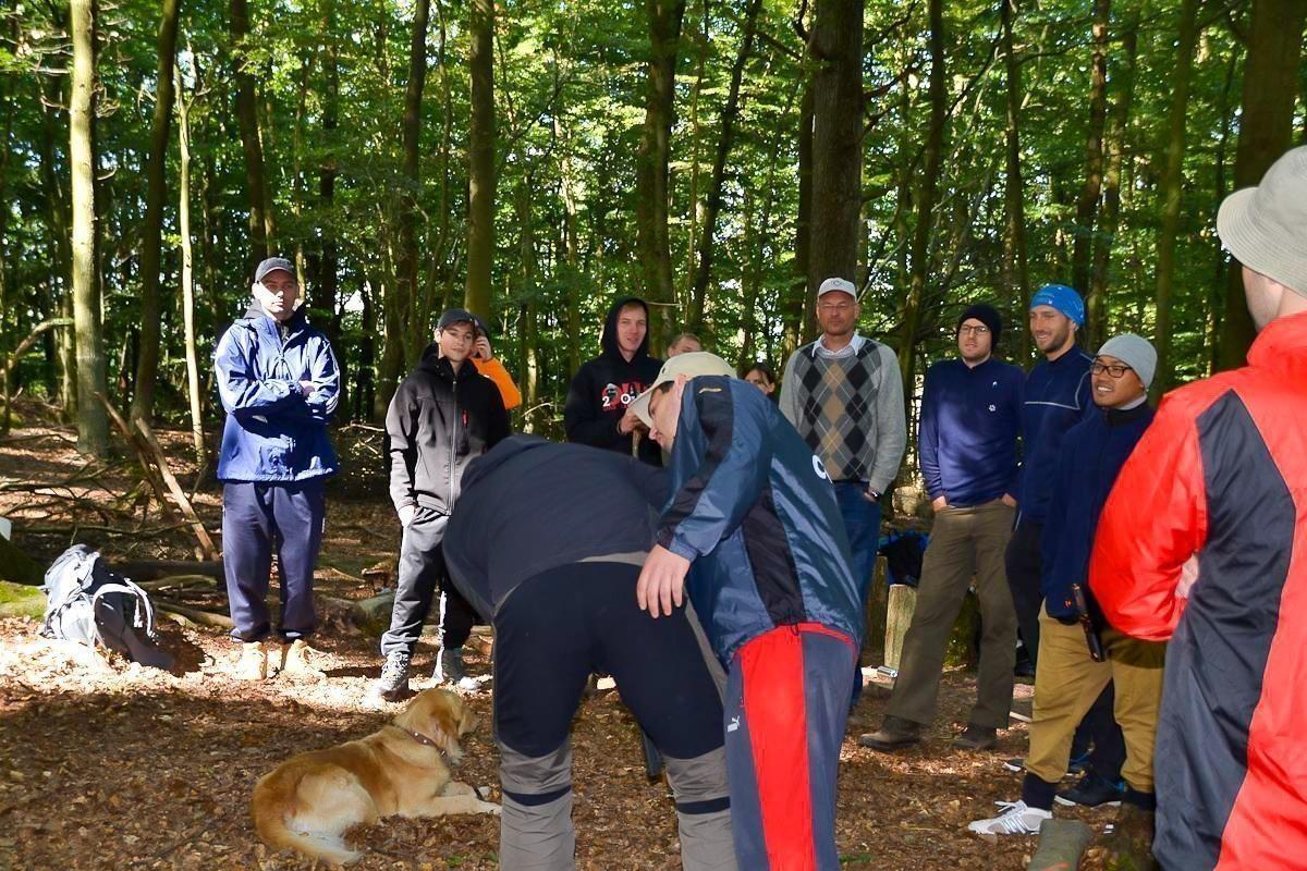 Gruppe hört einem Vortrag im Wald, im Hintergrund liegt ein Hund