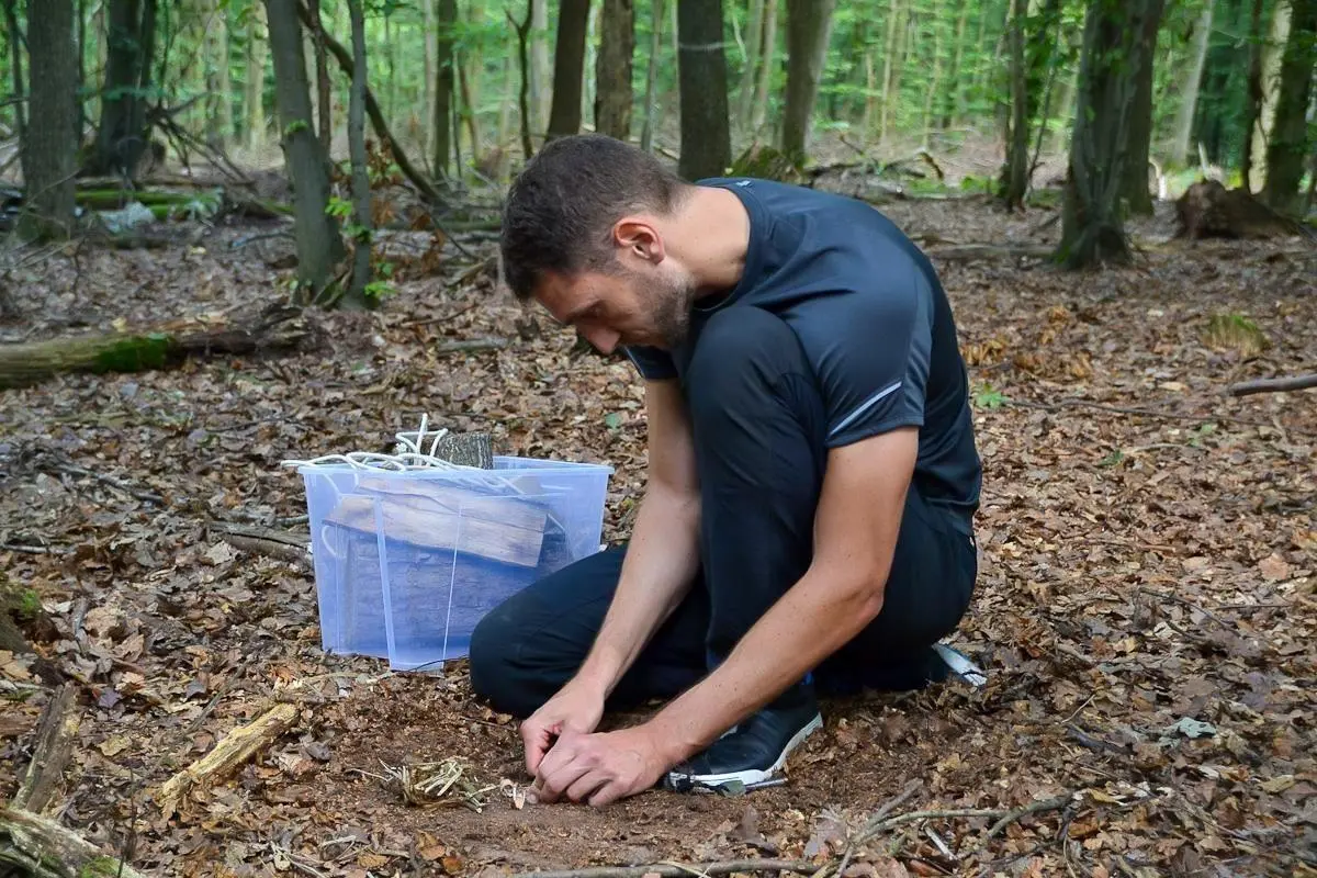 Mann bereitet Zunder im Waldboden vor, Holzstücke liegen daneben