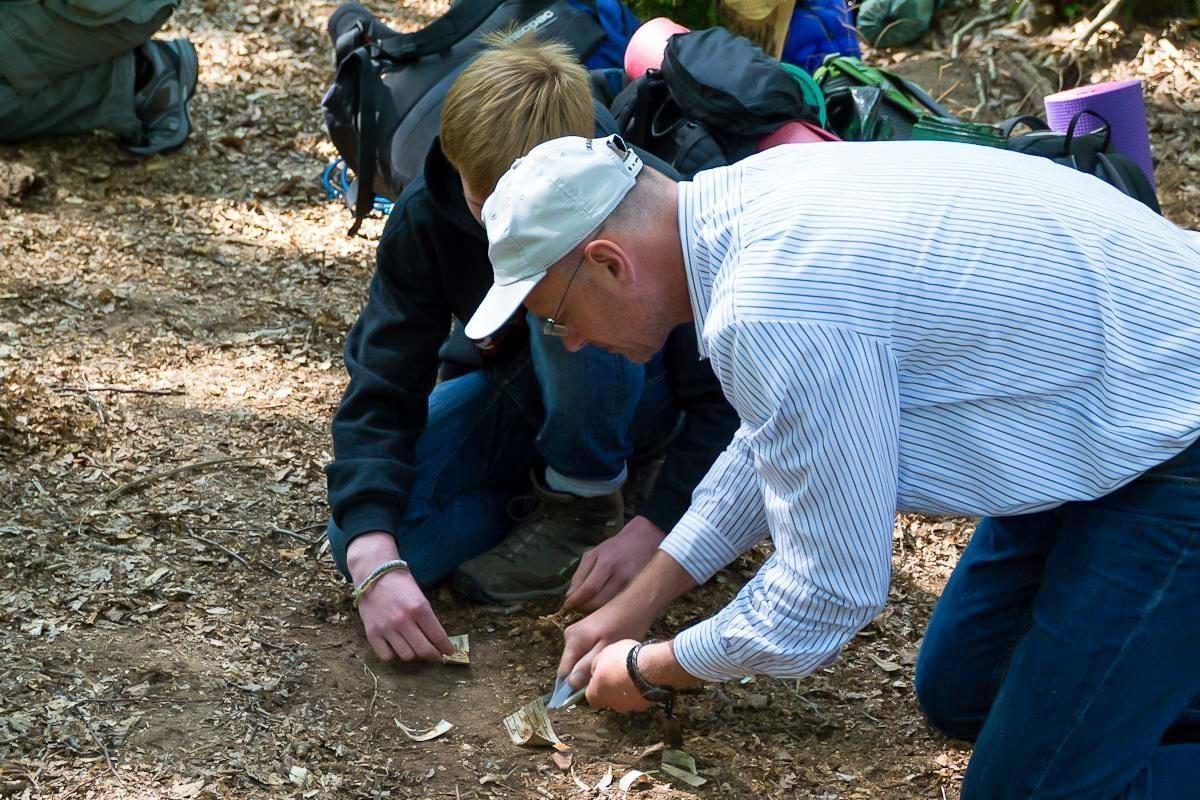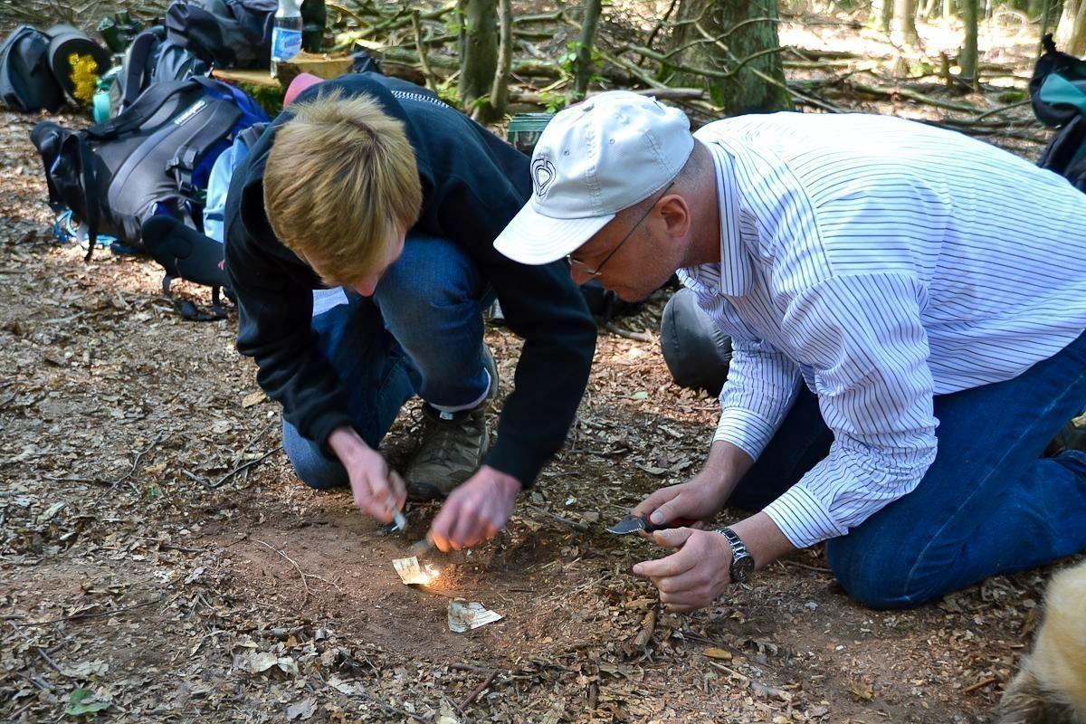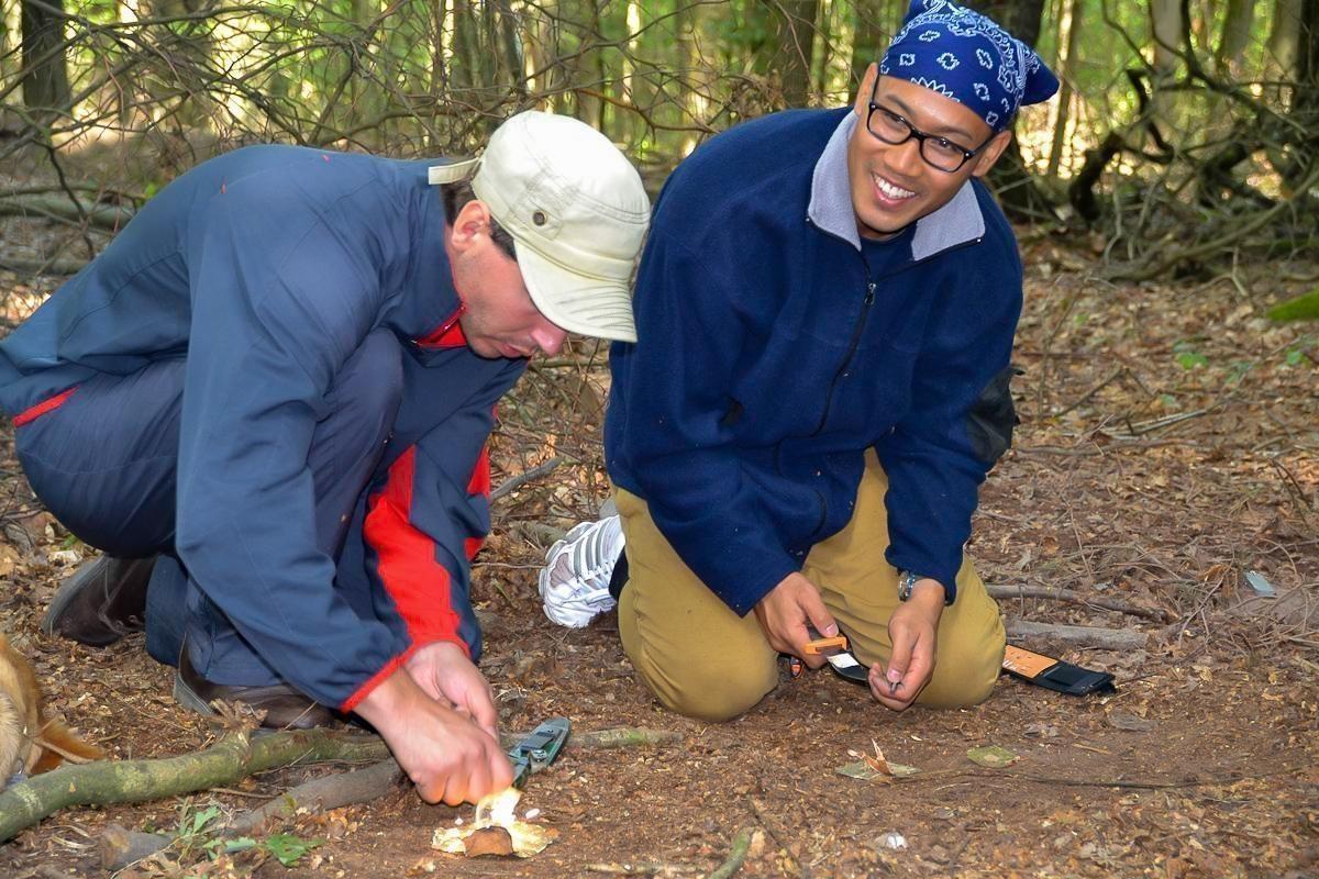 Zwei Personen bereiten Zunder mit einem Messer auf dem Waldboden vor