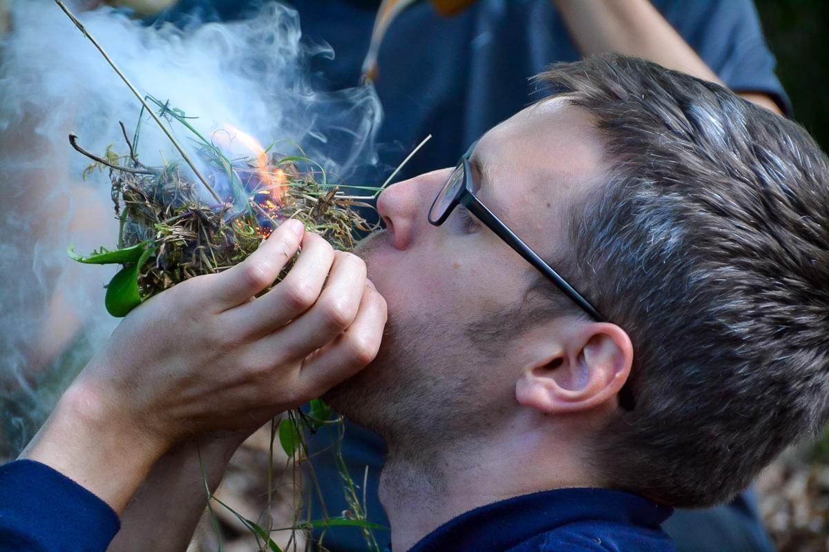 Mann hält eine Ansammlung von Pflanzenmaterial nahe an den Mund