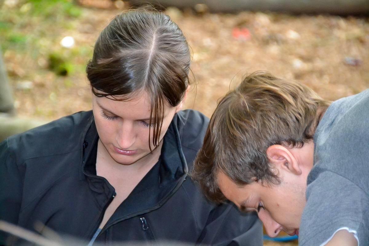 Zwei Personen konzentrieren sich auf eine Tätigkeit am Boden im Wald