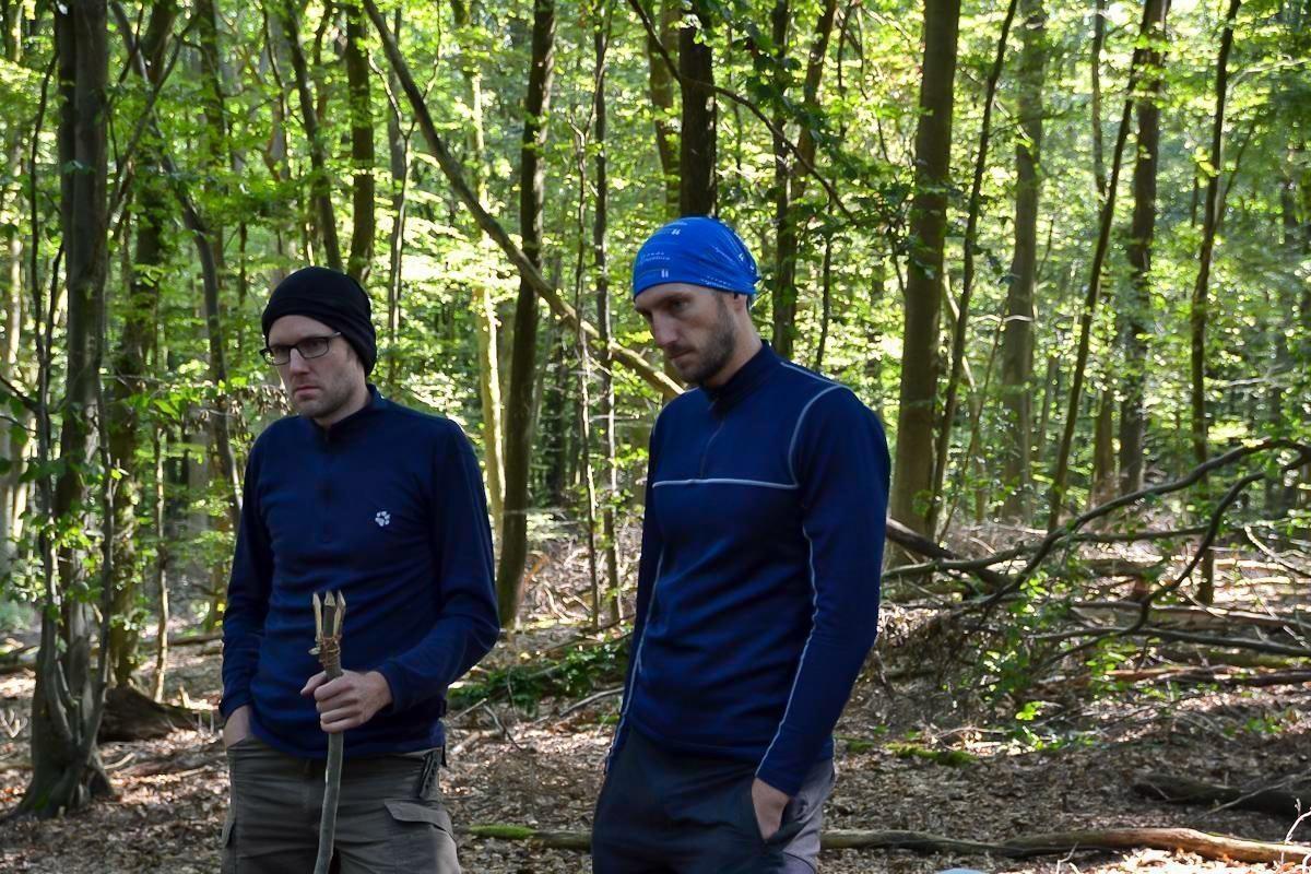 Zwei Personen stehen im Wald, einer hält einen Stock in der Hand