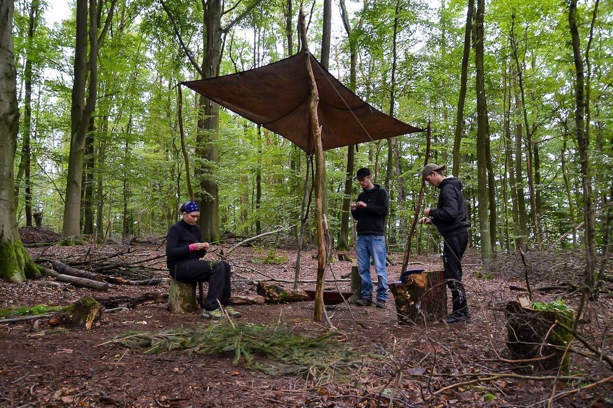 Gruppe sitzt um einen Feuerplatz unter einem Tarp im Wald