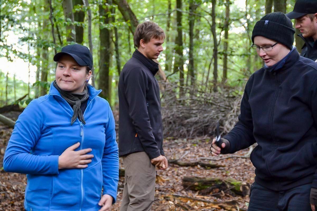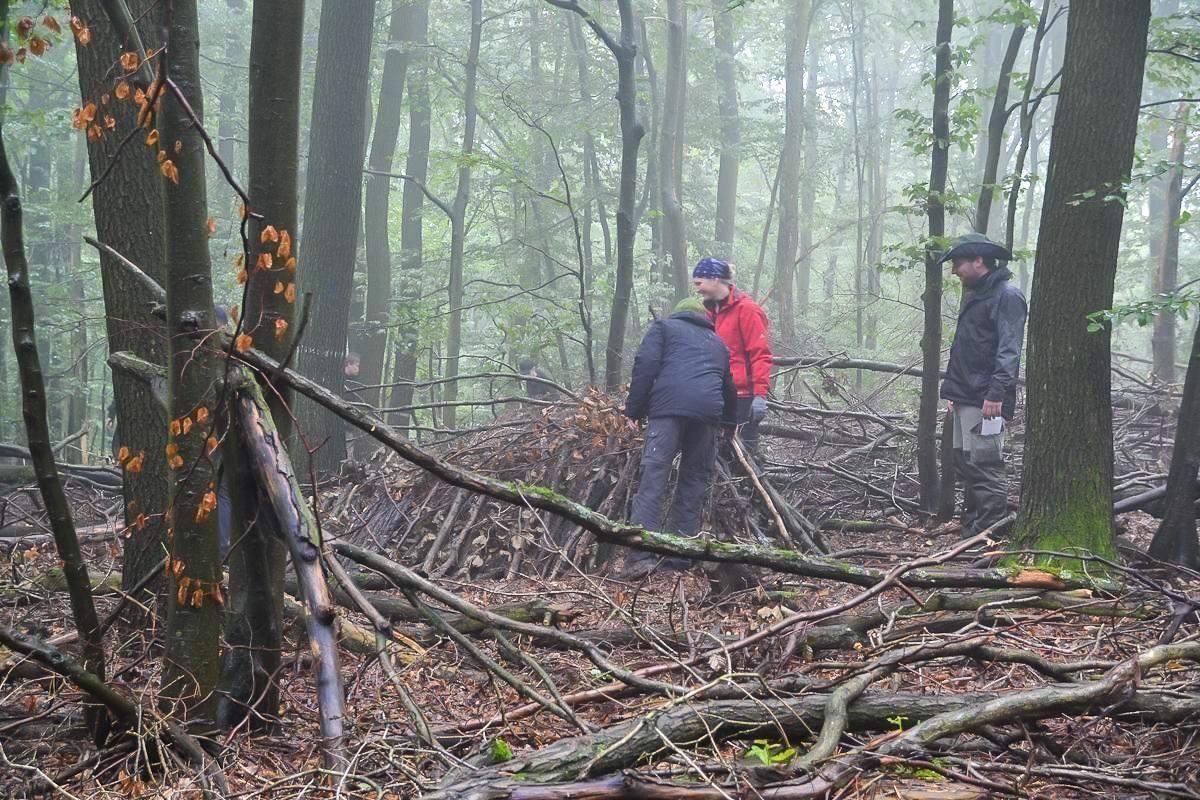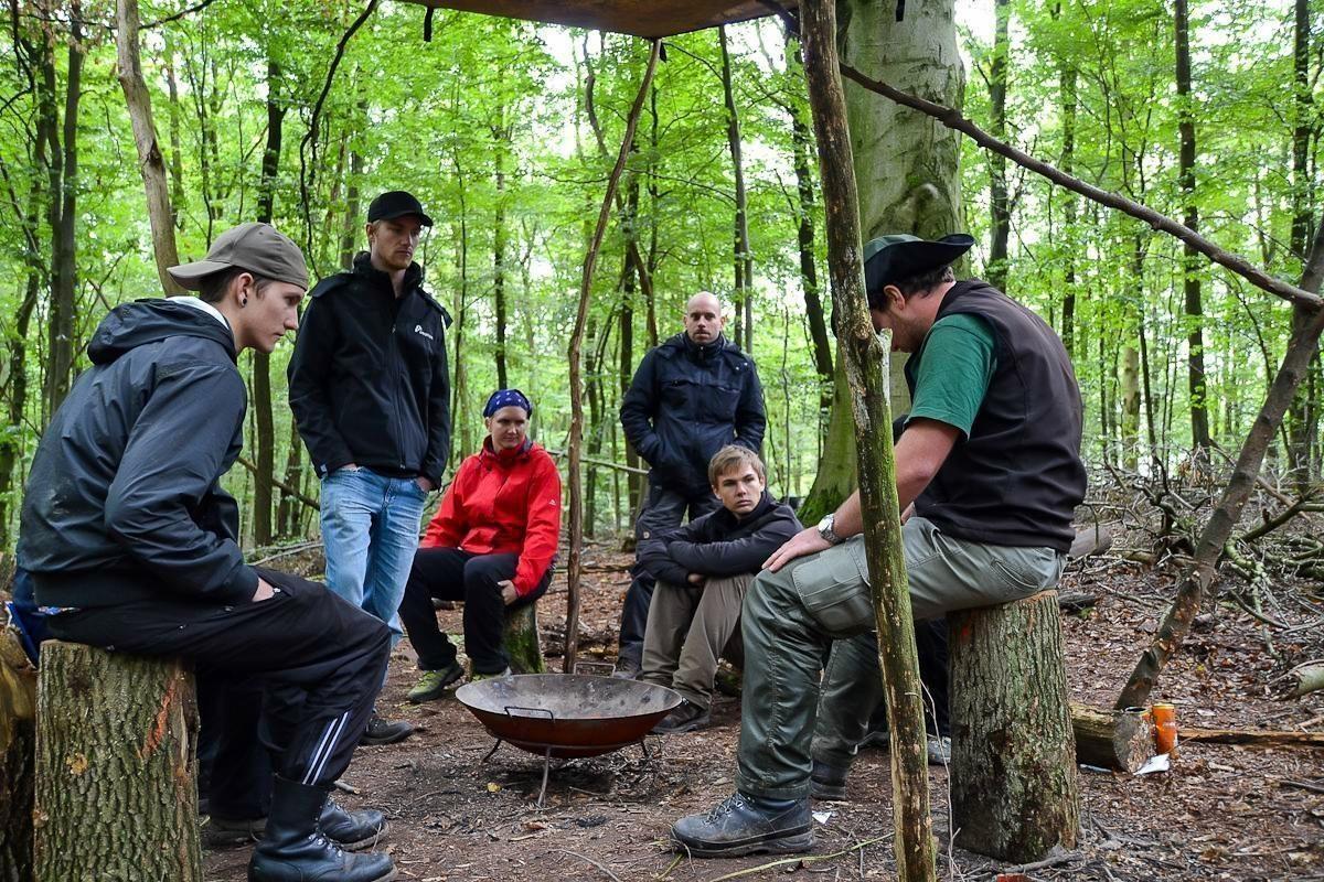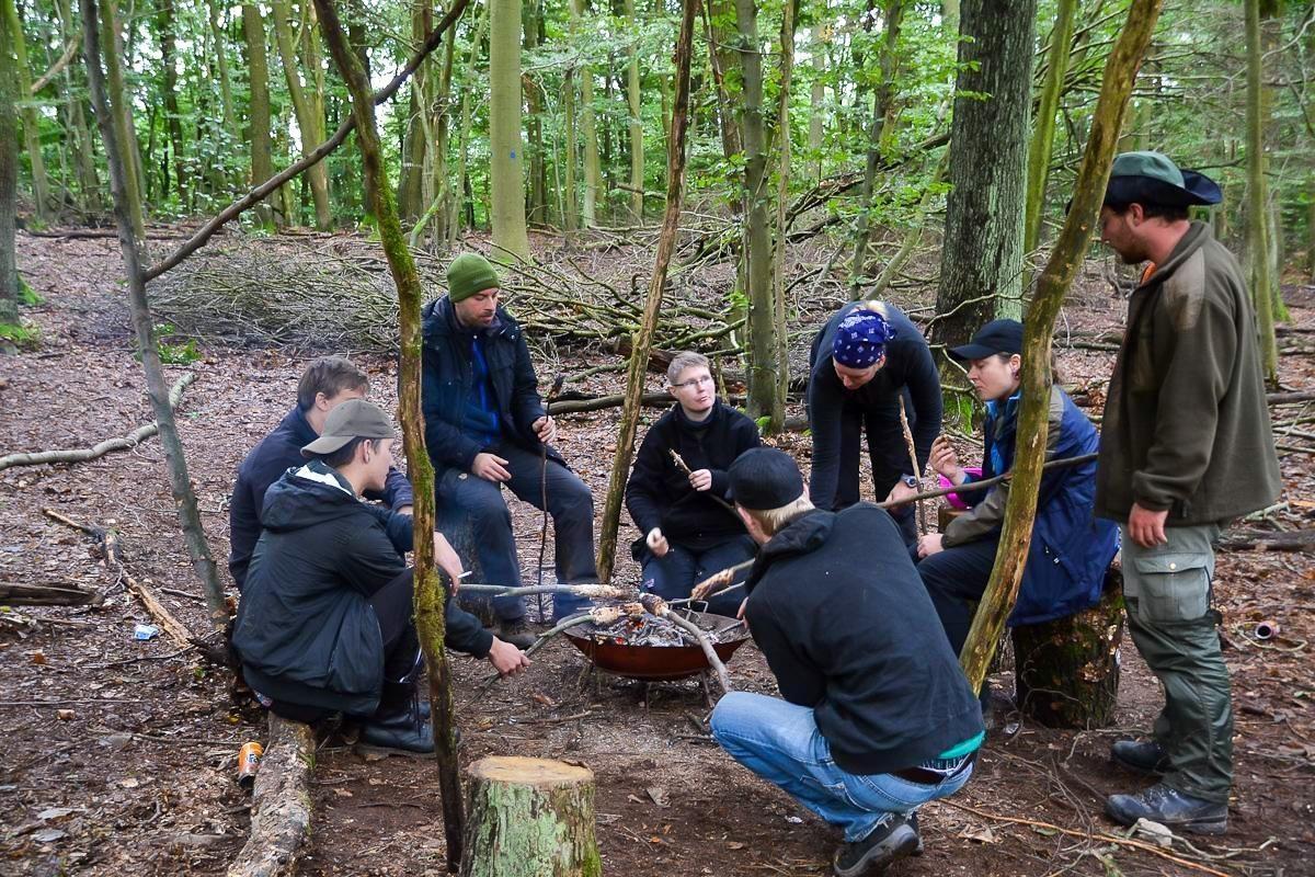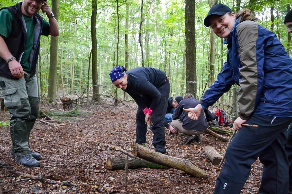 Gruppe im Wald steht um einen Haufen aus Ästen und Holz