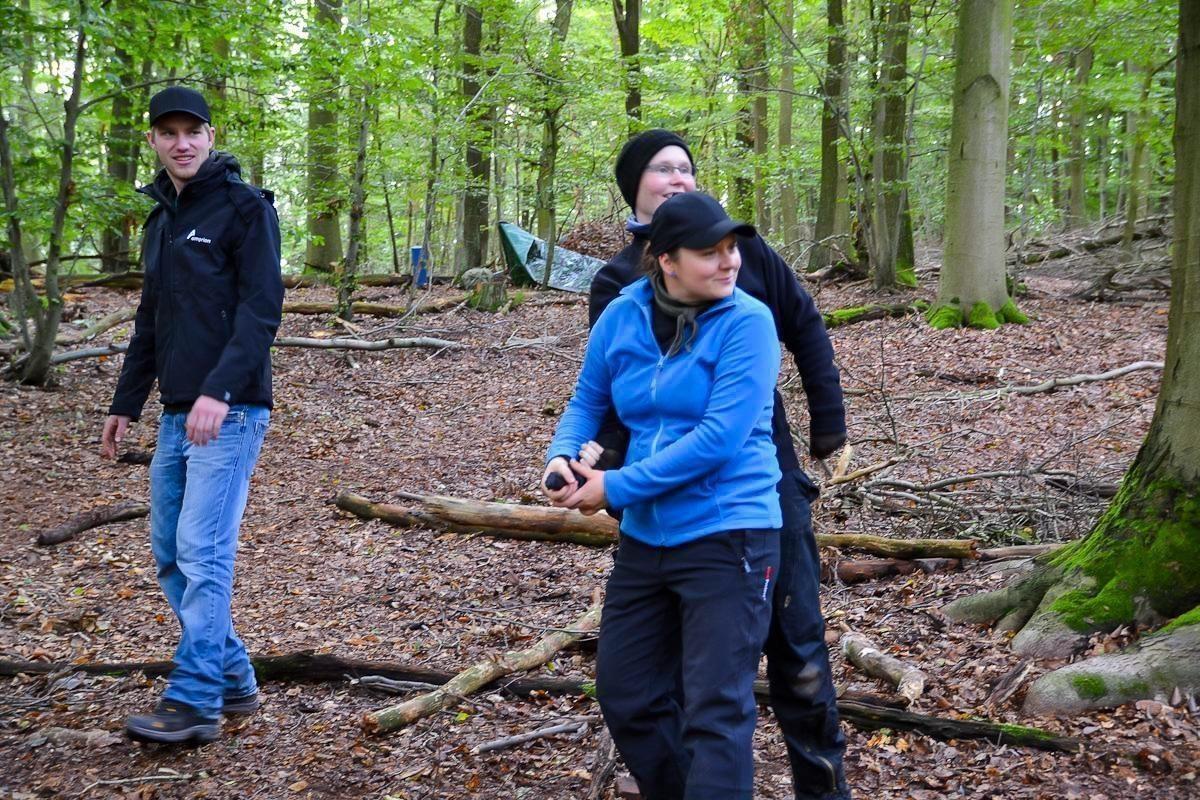 Drei Personen bewegen sich durch einen bewaldeten Bereich mit Laub und Ästen