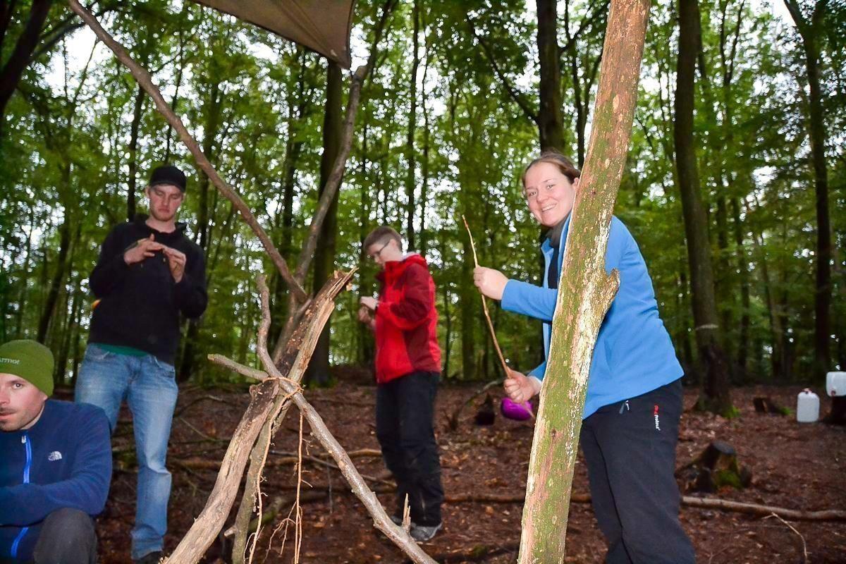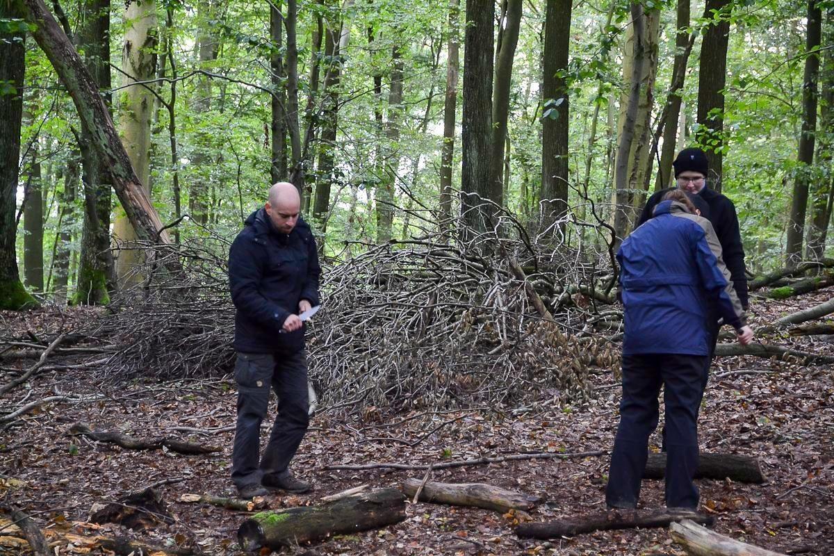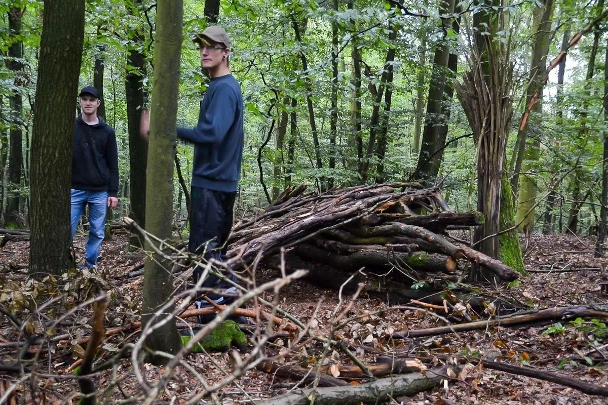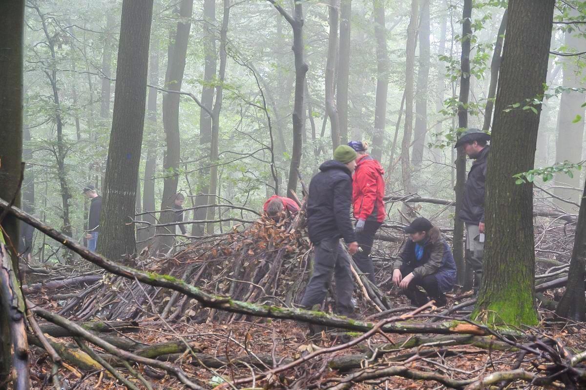 Gruppe baut eine Notunterkunft aus Ästen und Laub im Wald