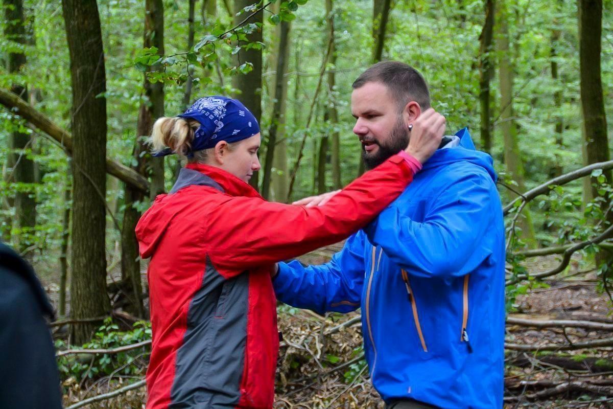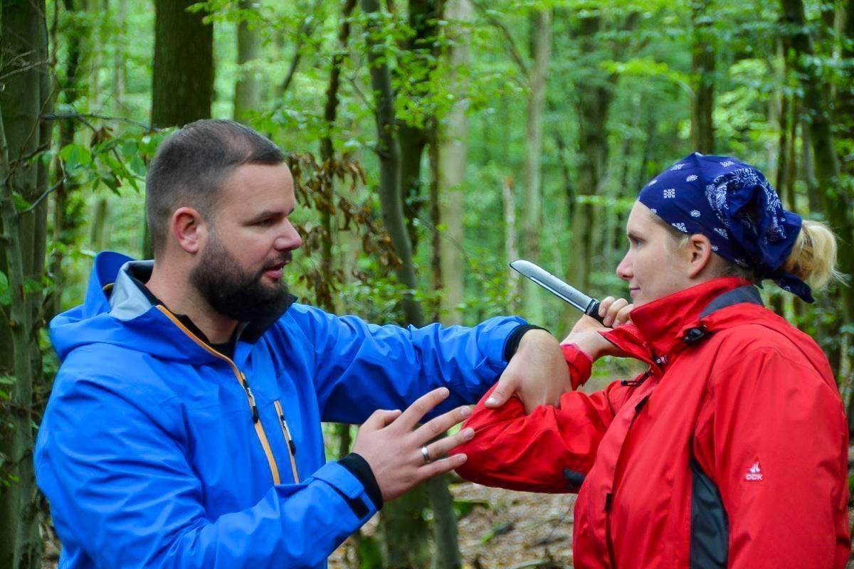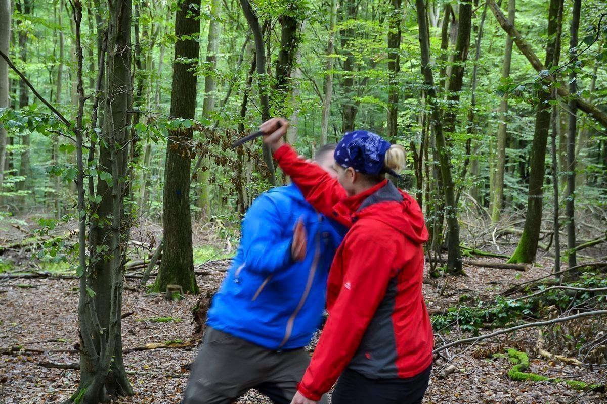 Zwei Personen in Outdoor-Bekleidung üben eine Nahkampfsituation im Wald
