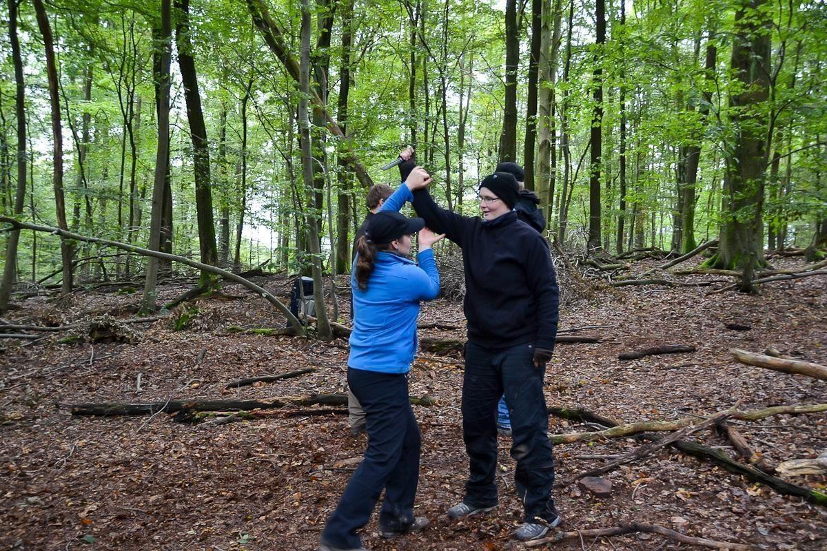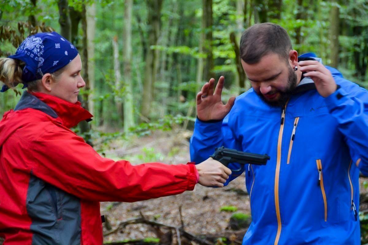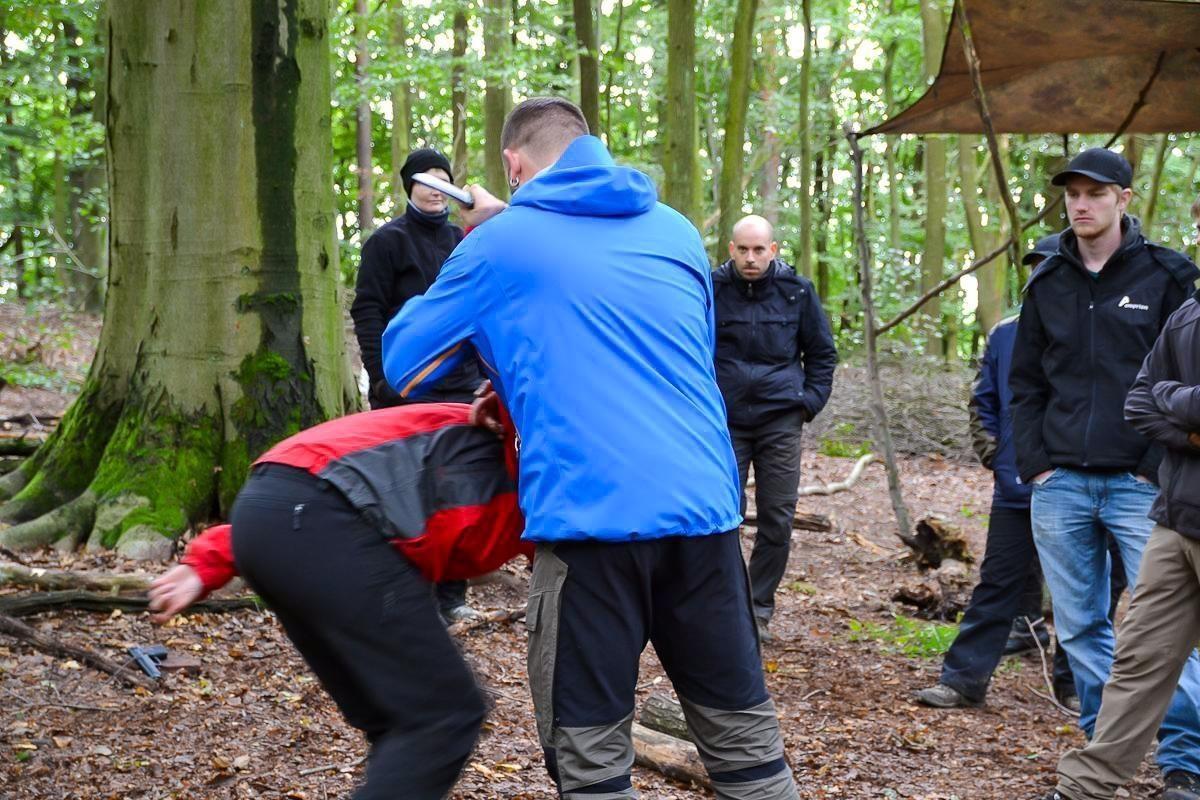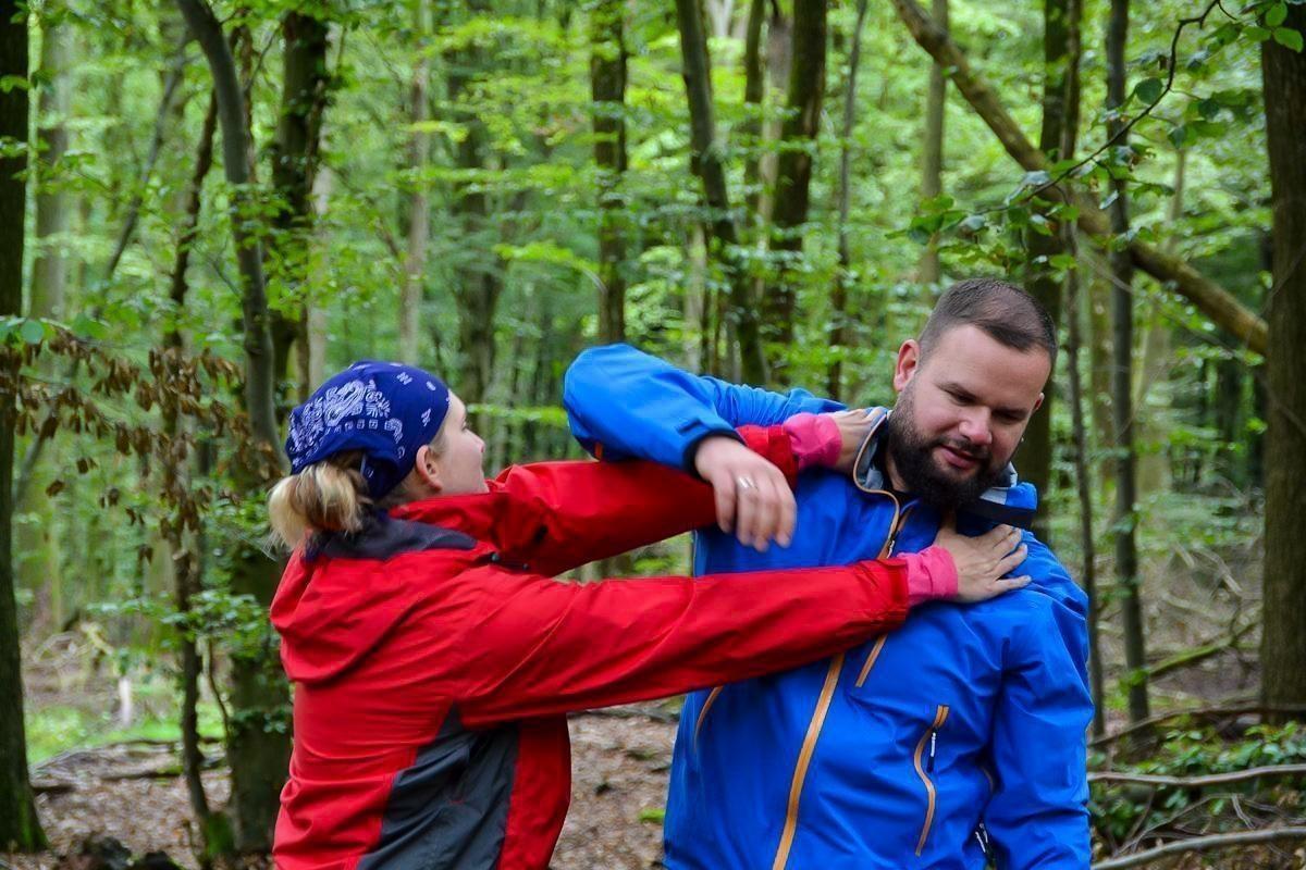 Zwei Personen in Outdoor-Bekleidung üben eine Nahkampfsituation im Wald