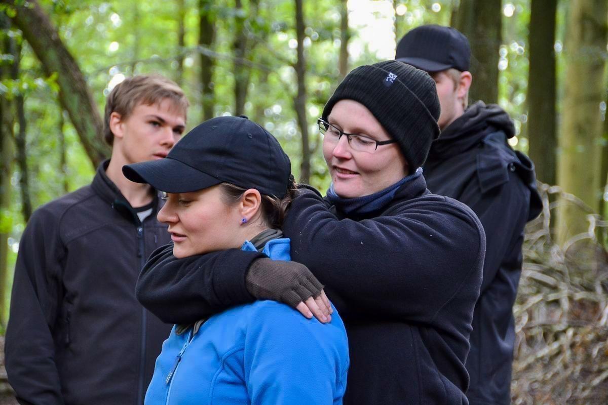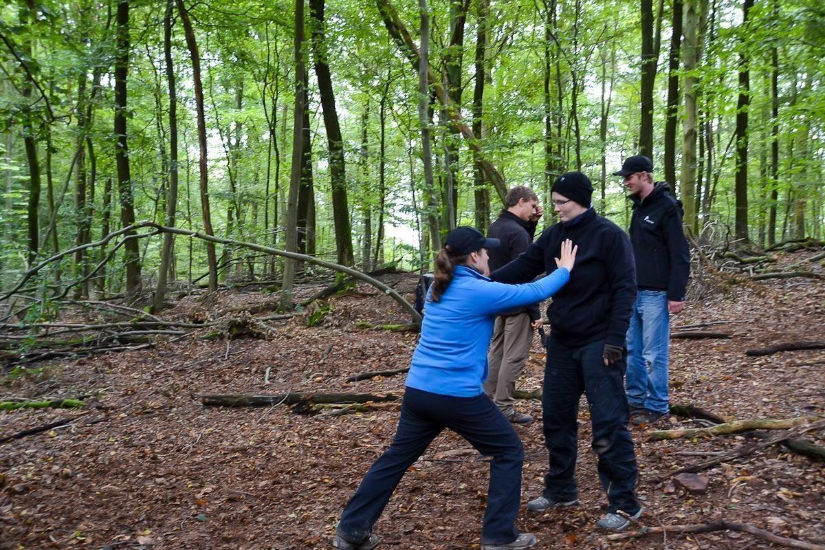 Eine Person übt eine Selbstverteidigungstechnik im Wald mit drei weiteren Personen
