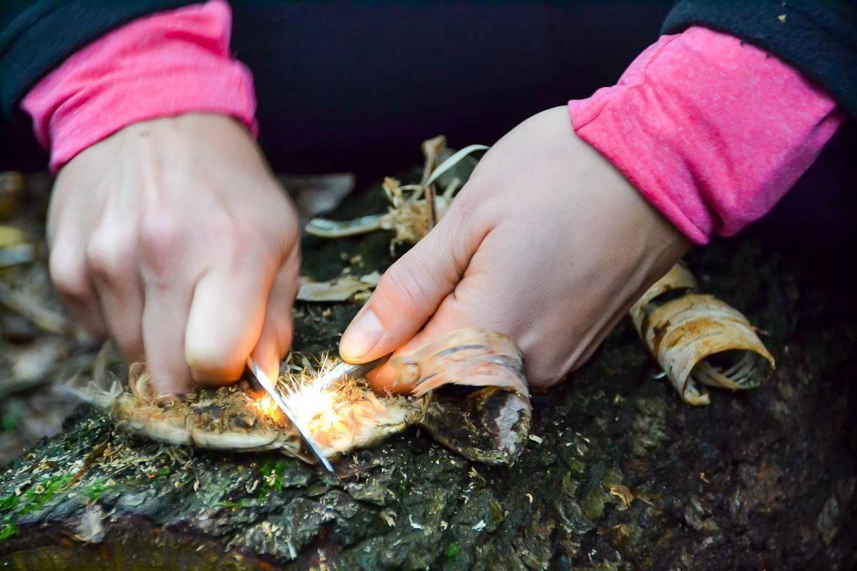 Feuerstahl erzeugt Funken auf Zunder aus Rinde mit einem Messer