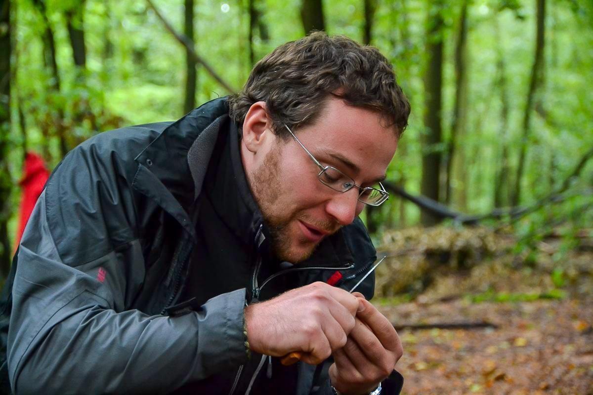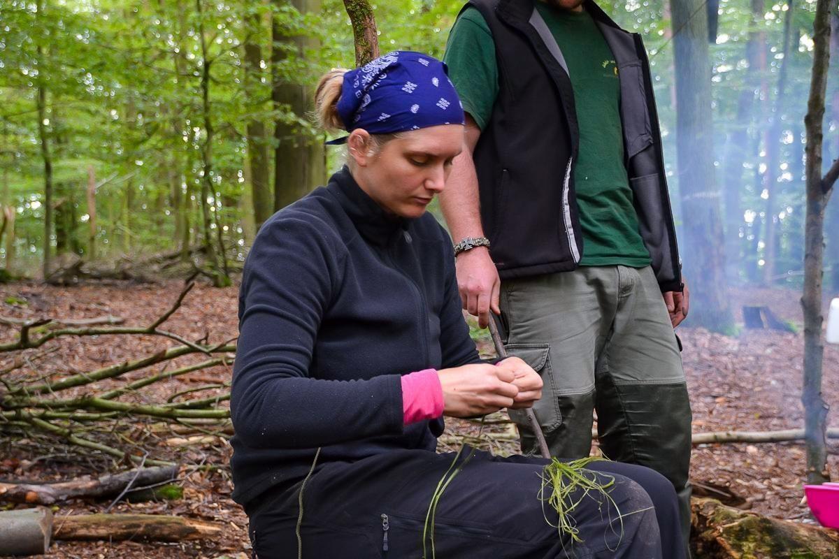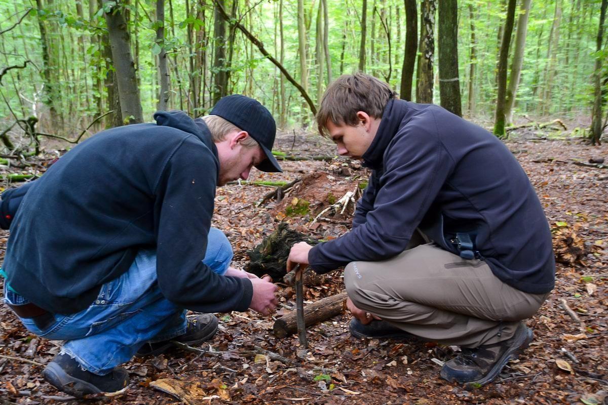 Zwei Personen sitzen im Wald und arbeiten an einem Feuerzeug