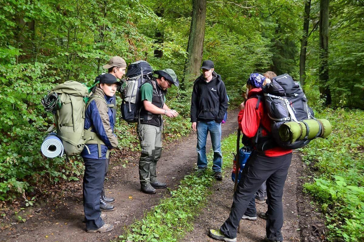 Gruppe mit Rucksäcken steht auf Waldweg und diskutiert Ausrüstung