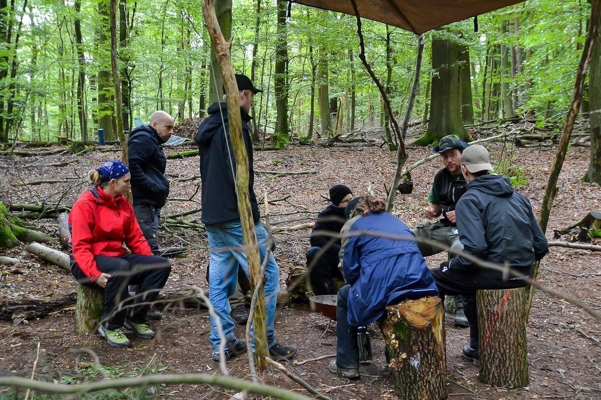Gruppe sitzt auf Baumstümpfen unter einem Tarp im Wald und diskutiert