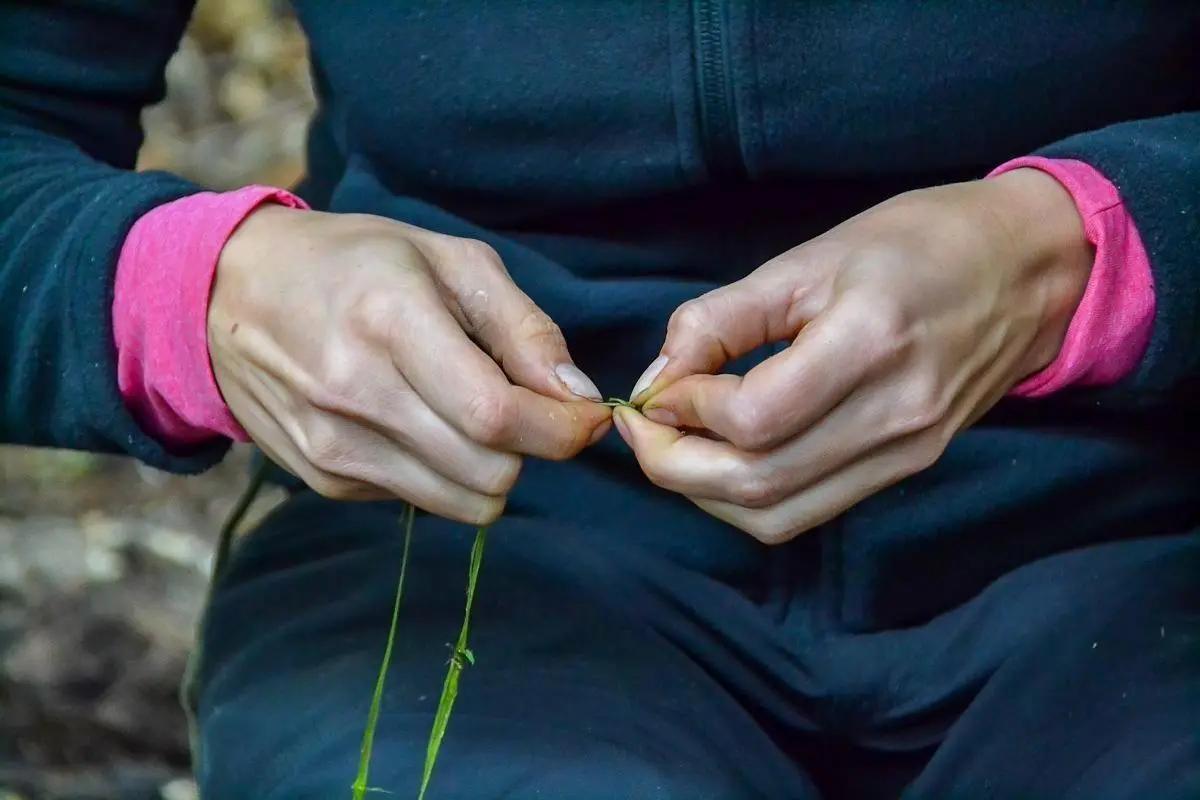Hände flechten Gräser zu einer Schnur oder einem Band