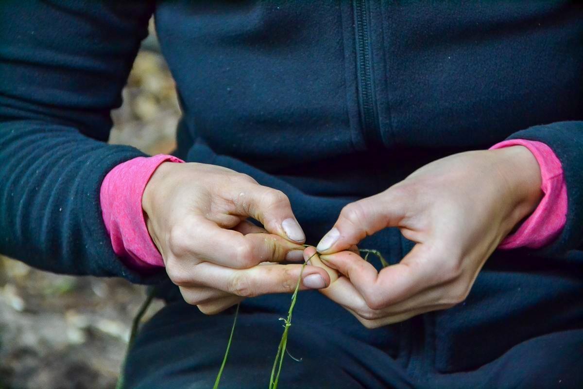 Hände flechten Pflanzenmaterial zu einer Schnur