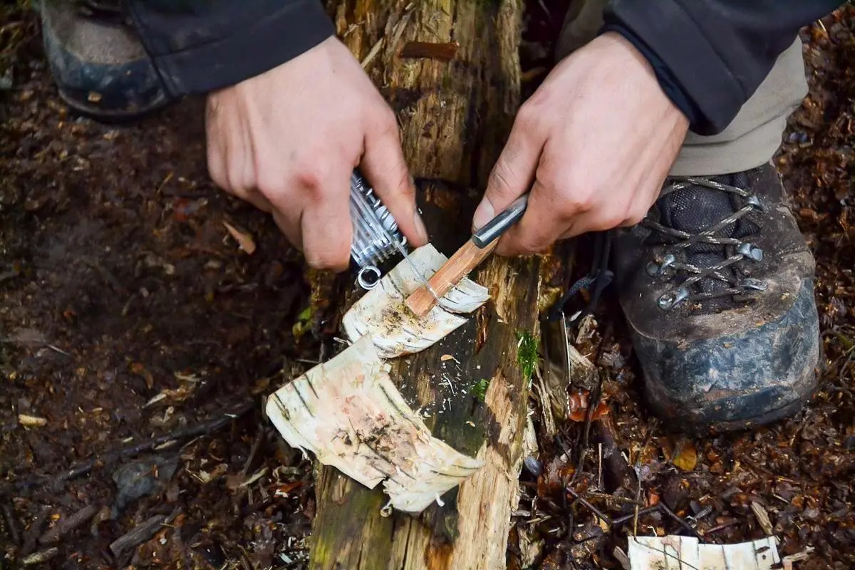 Messer schneidet Rinde von einem Holzstück zur Herstellung von Zunder