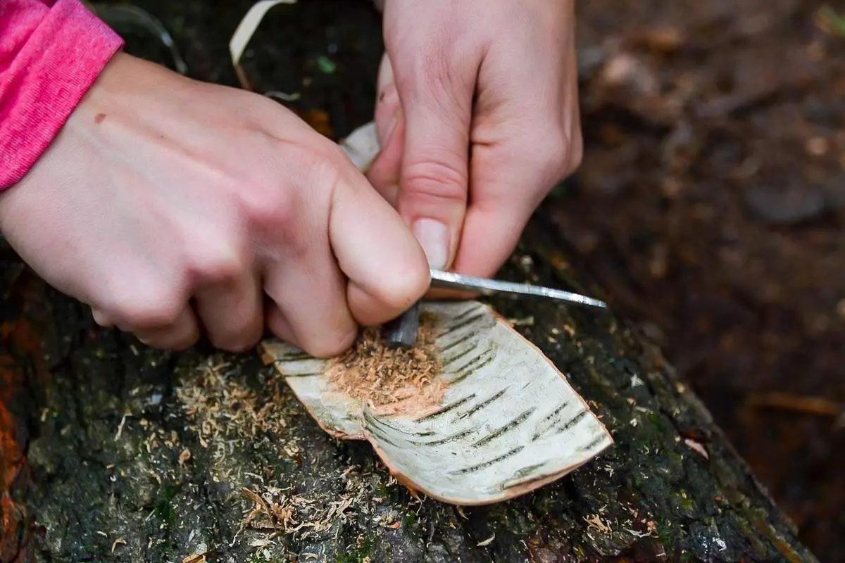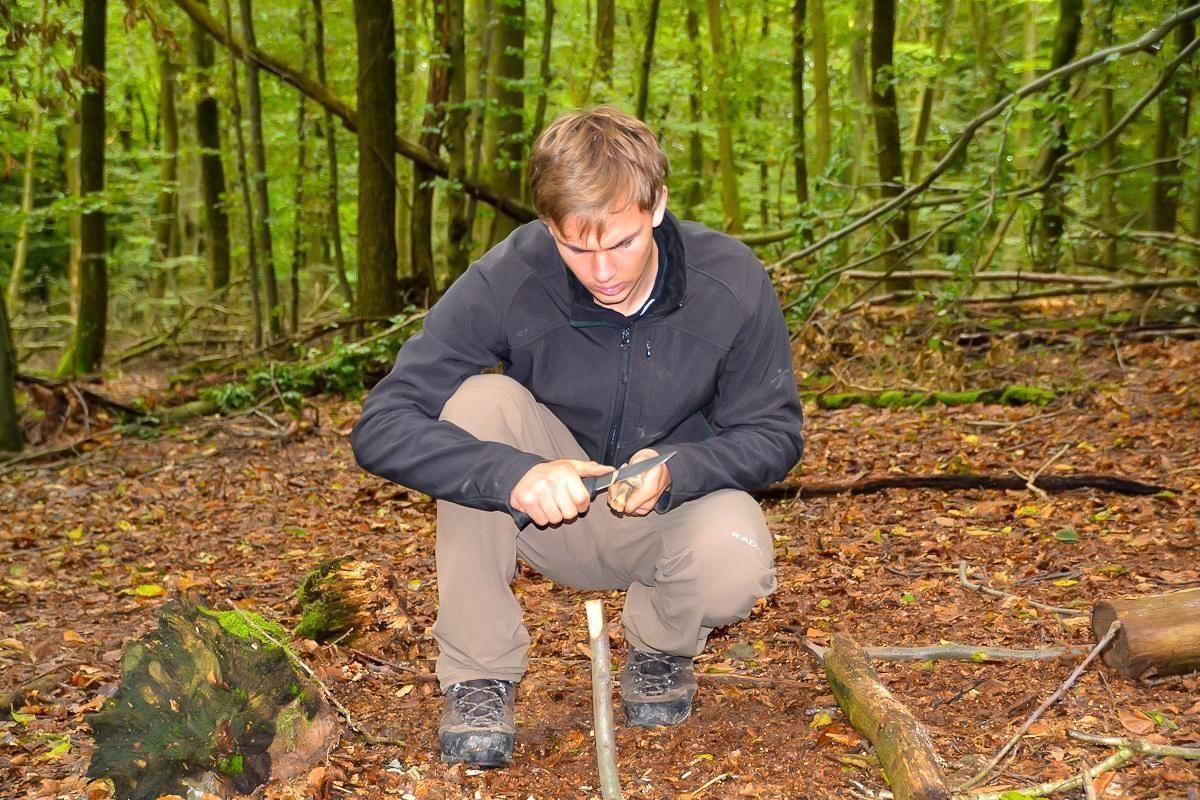 Holzstück wird mit einem Messer bearbeitet, um Zunder zu erzeugen