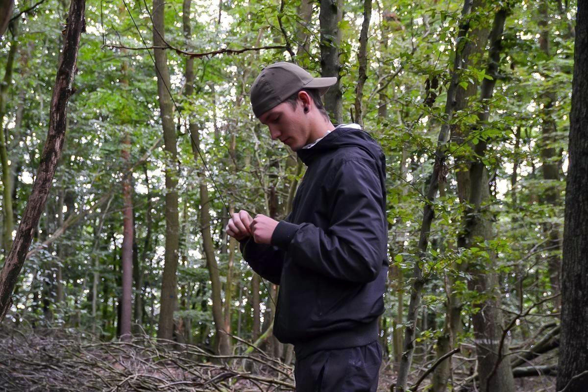Zwei Personen bauen eine Schlagfalle (Figure-Four-Falle) im Wald