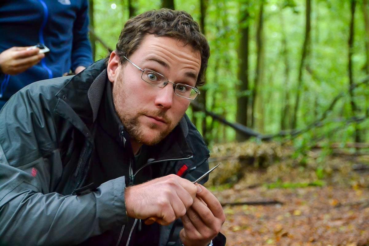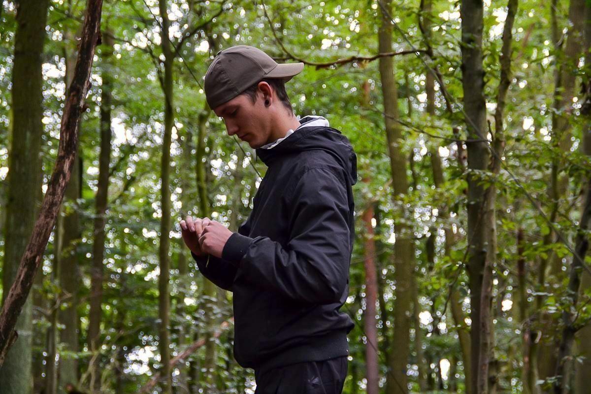 Junger Mann steht im Wald und betrachtet einen Gegenstand in seinen Händen