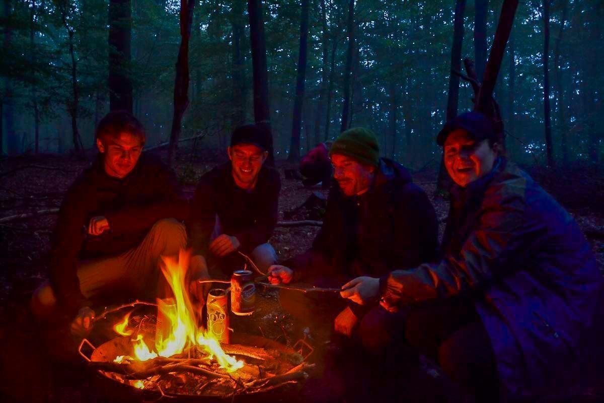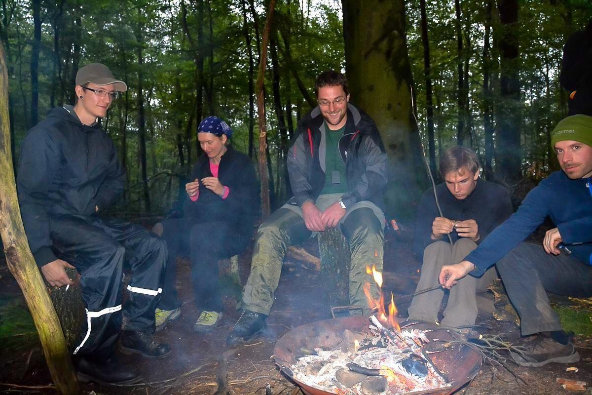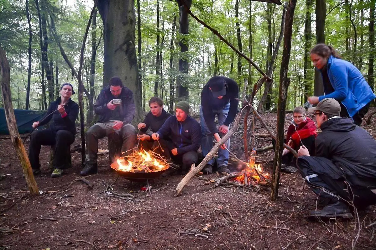 Gruppe sitzt um ein Feuer in einem Wald, Holzstücke und Töpfe sind sichtbar
