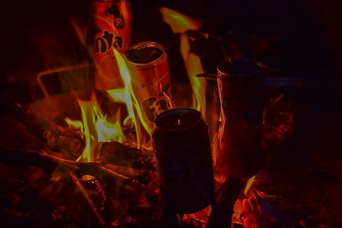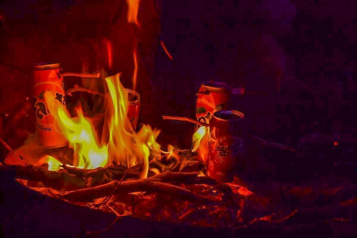 Dosen stehen auf einem Holzstapel über einem kleinen Bodenfeuer