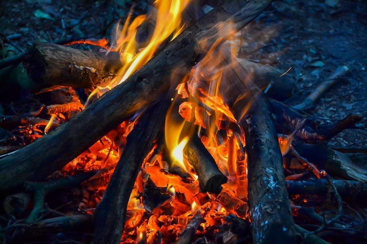 Kleine Flamme brennt in einem improvisierten Feuerplatz unter einem Tarp