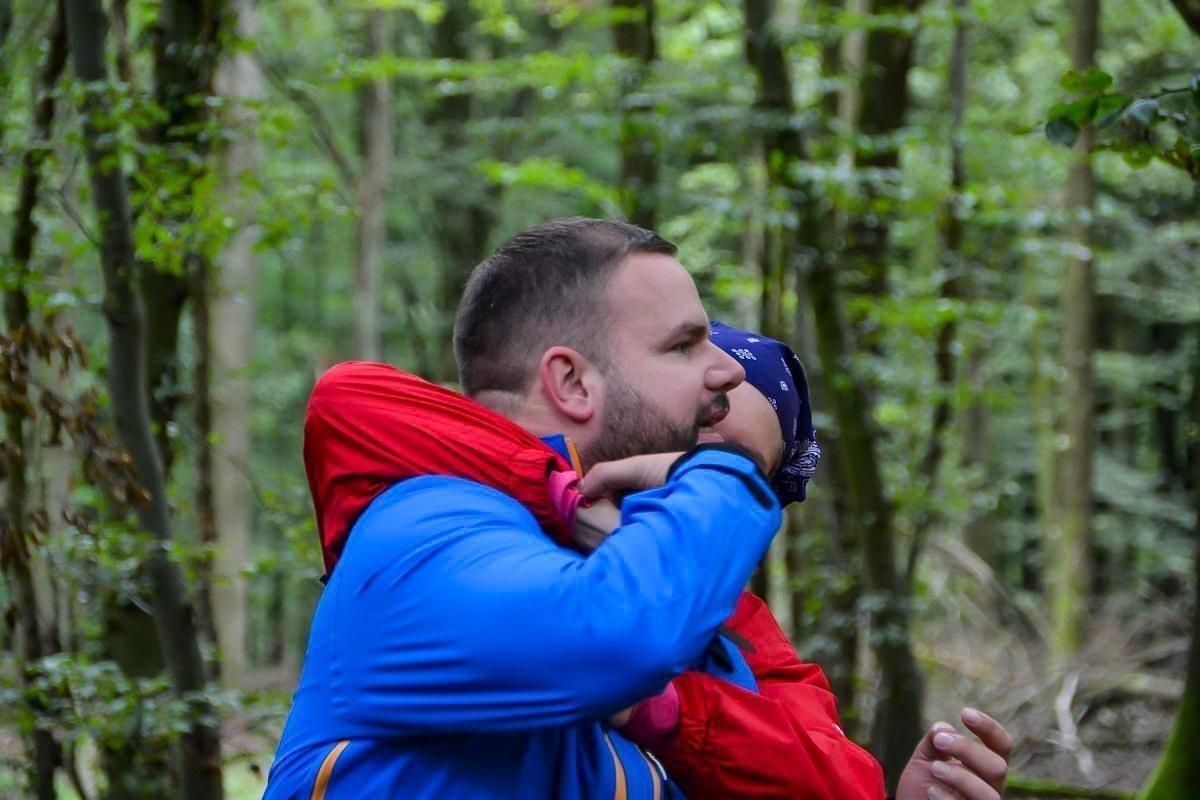 Mann trägt Kind auf dem Rücken im Wald