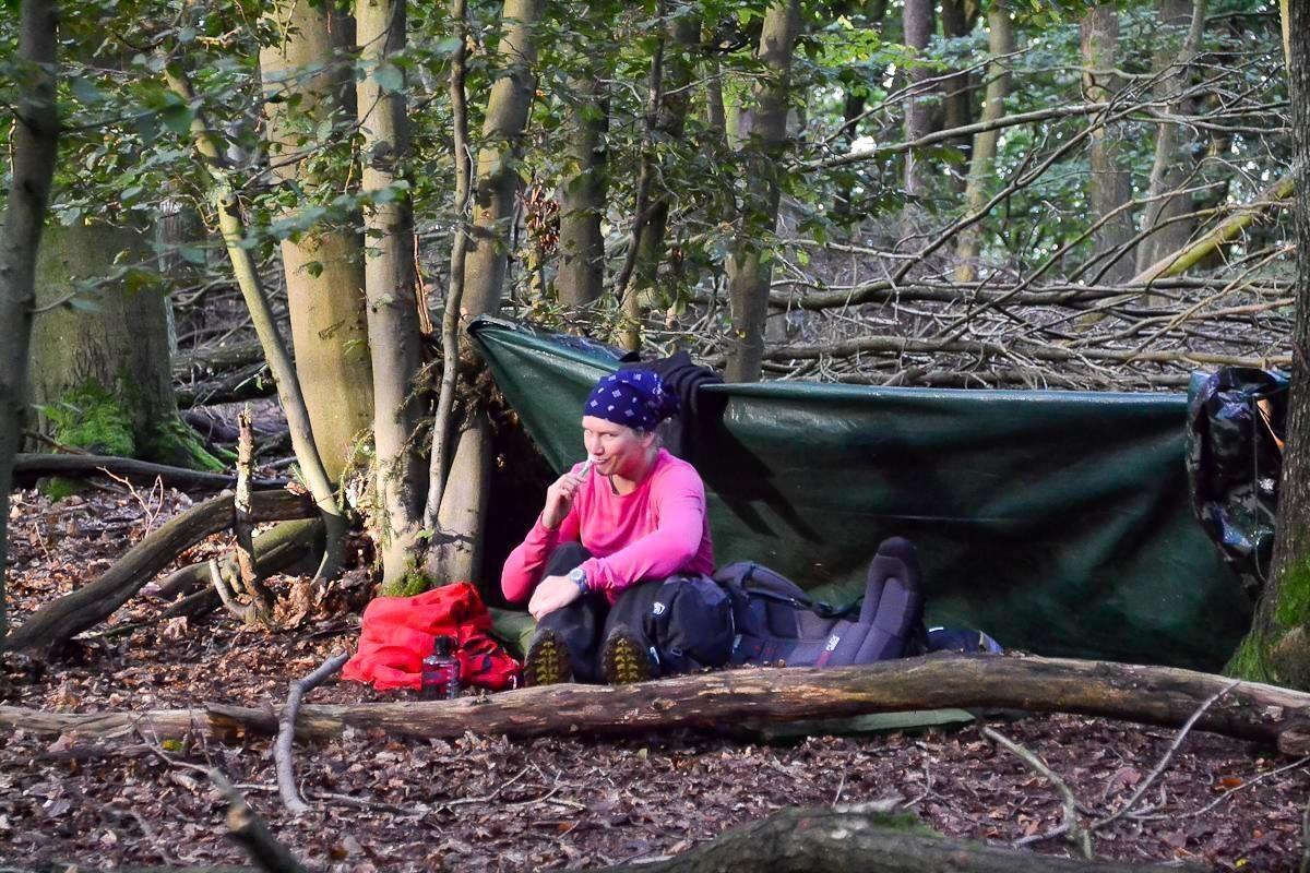 Person sitzt vor einer Tarp-Notunterkunft im Wald und hält einen Stock