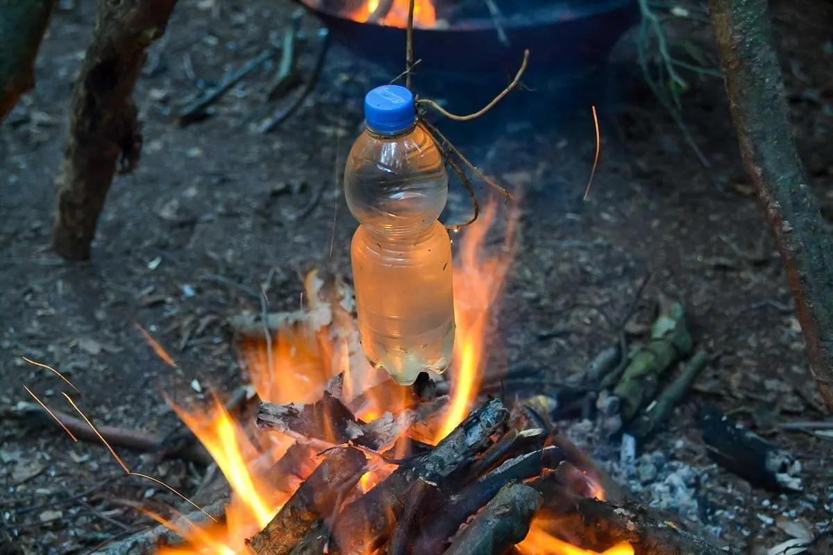 Wasserflasche schwebt über einem kleinen Feuer aus Holzscheiten