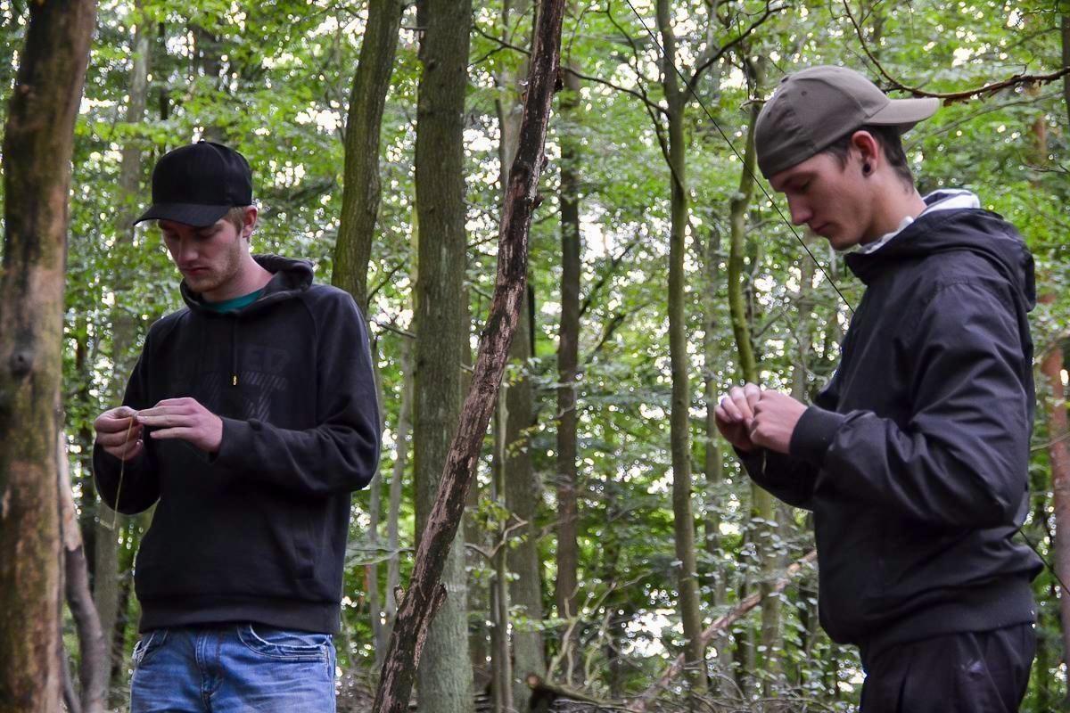 Zwei Personen arbeiten konzentriert mit Schnüren im Wald