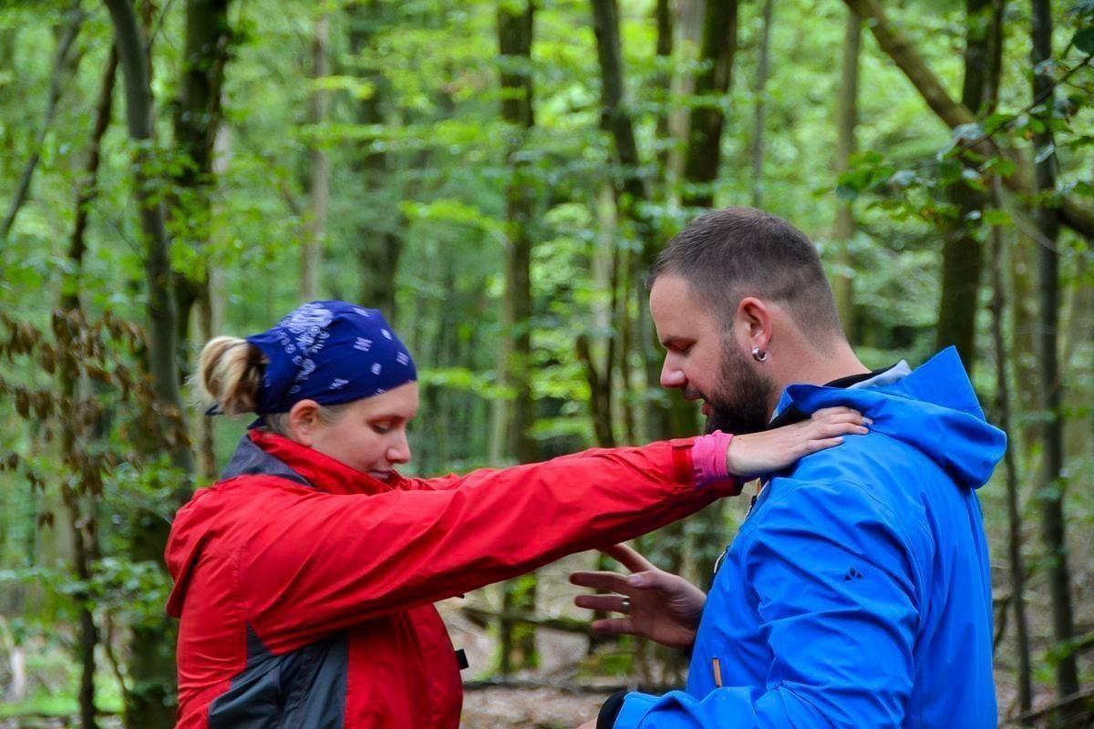 Zwei Personen üben eine Technik im Wald, Hände sind erhoben