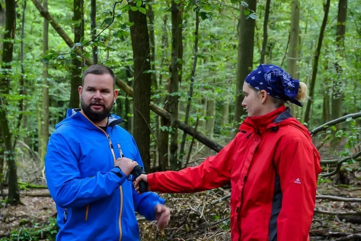 Zwei Personen üben eine Technik zur Kontrolle in einem Waldgebiet