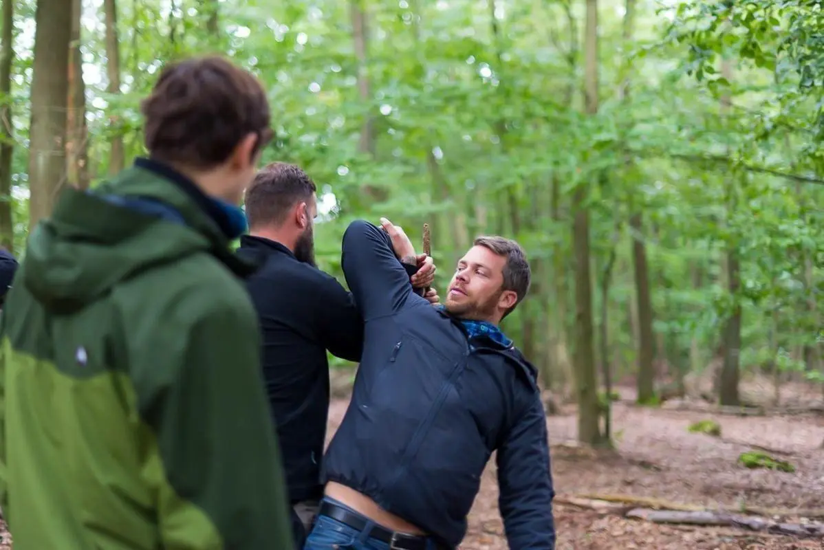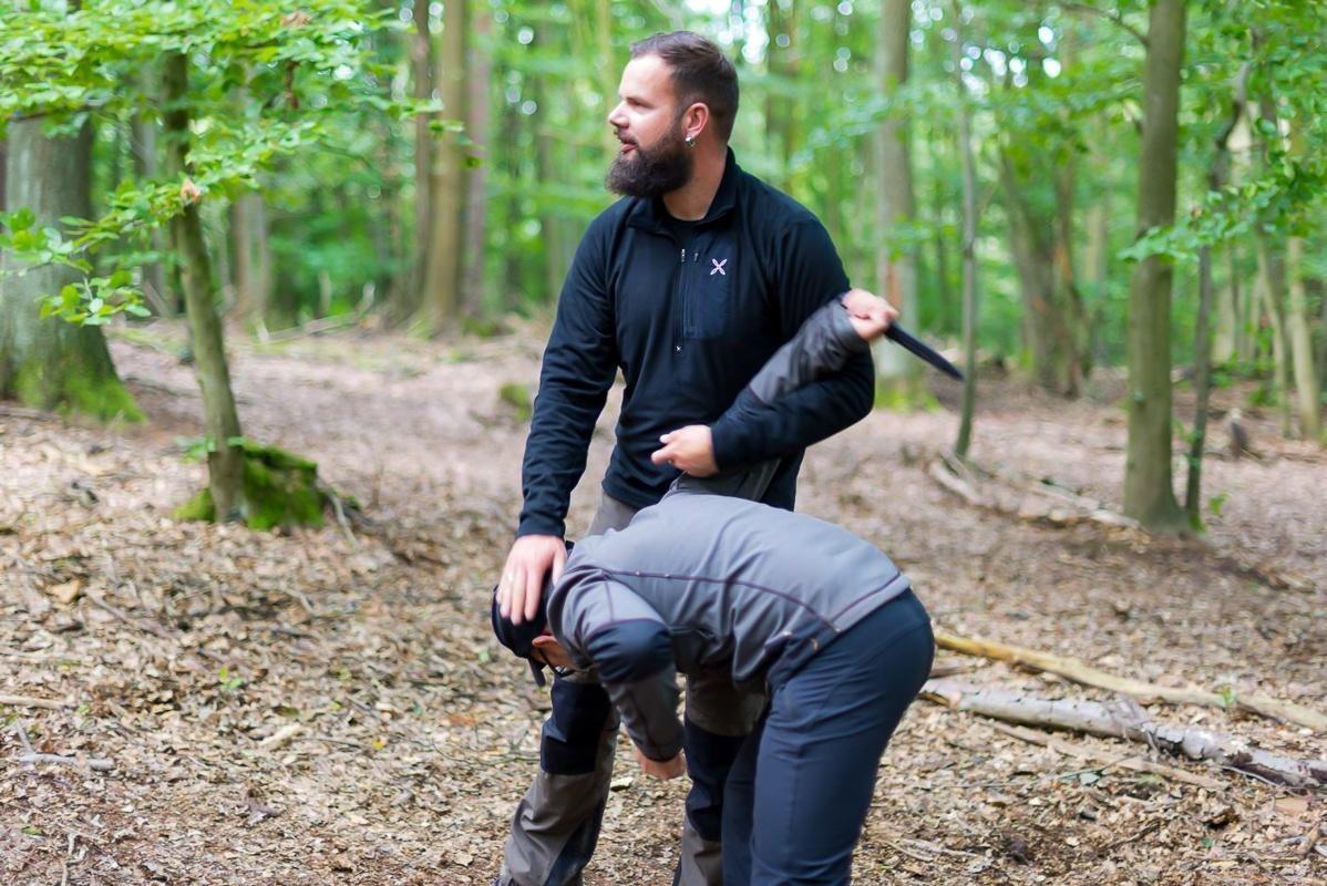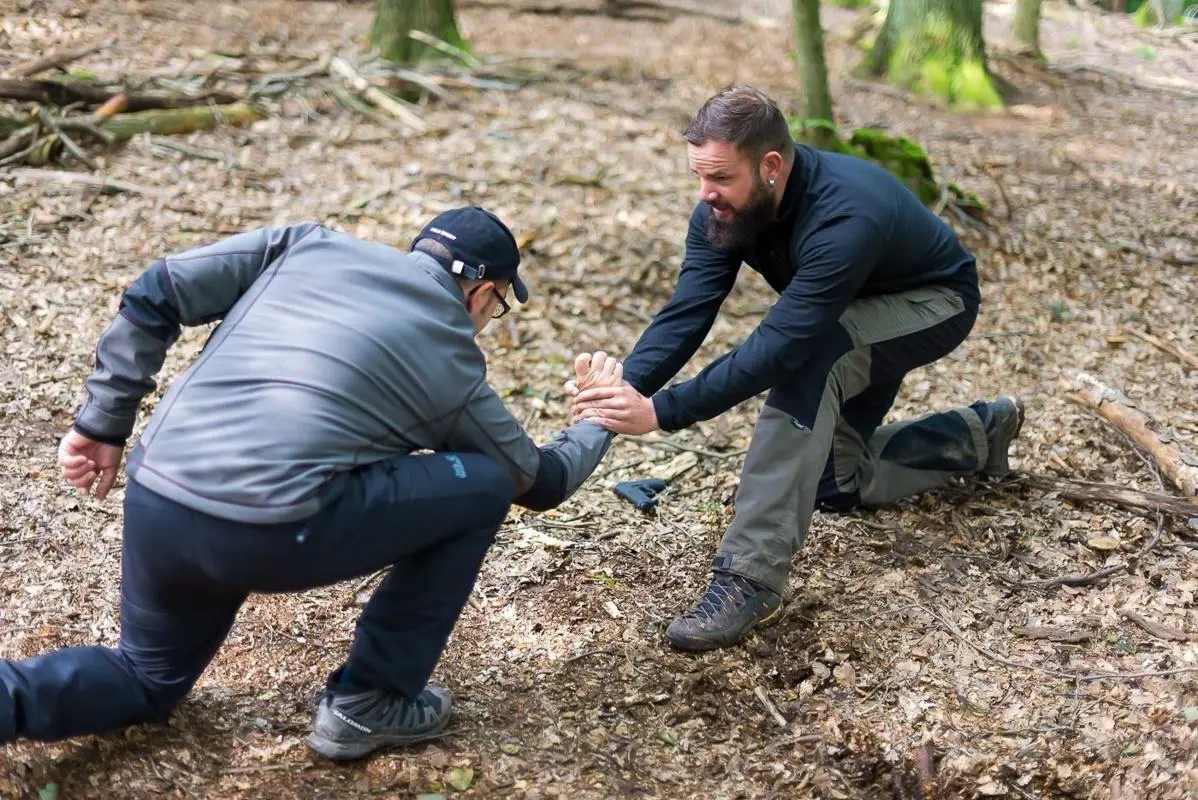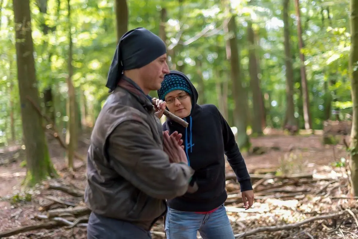 Zwei Personen üben eine Technik im Wald, einer hält ein Messer in der Hand