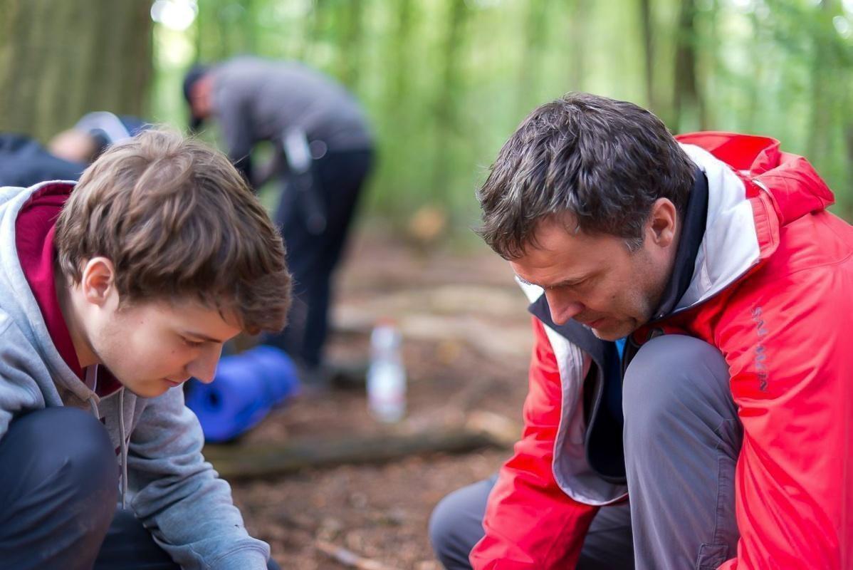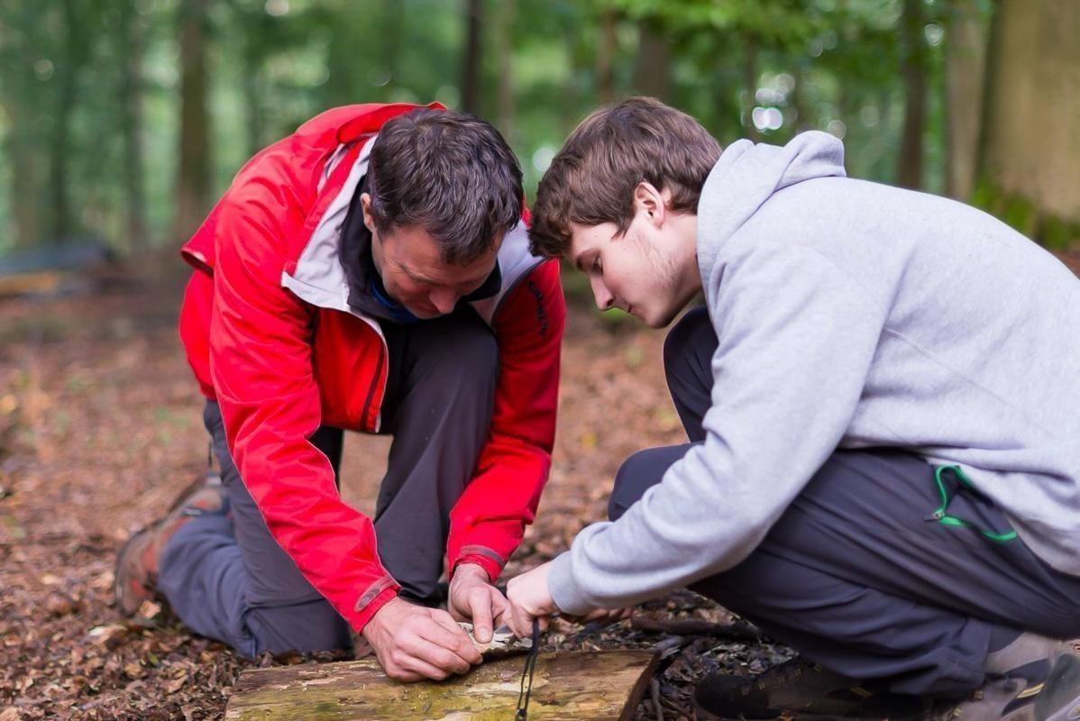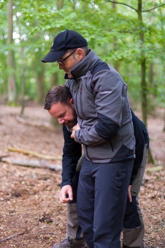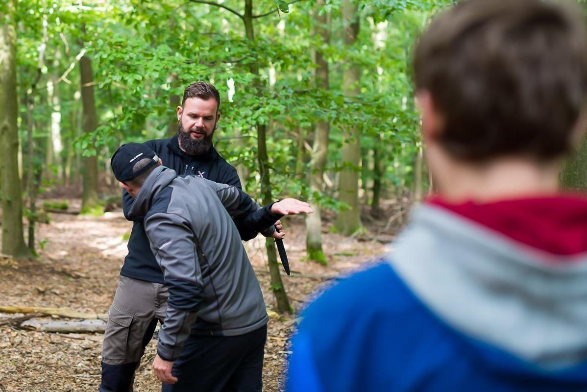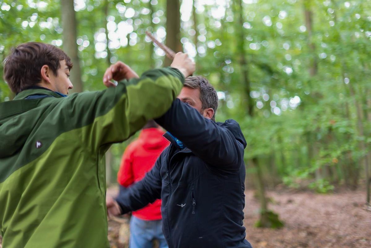 Zwei Personen üben eine Technik im Wald, einer hält ein Messer in der Hand