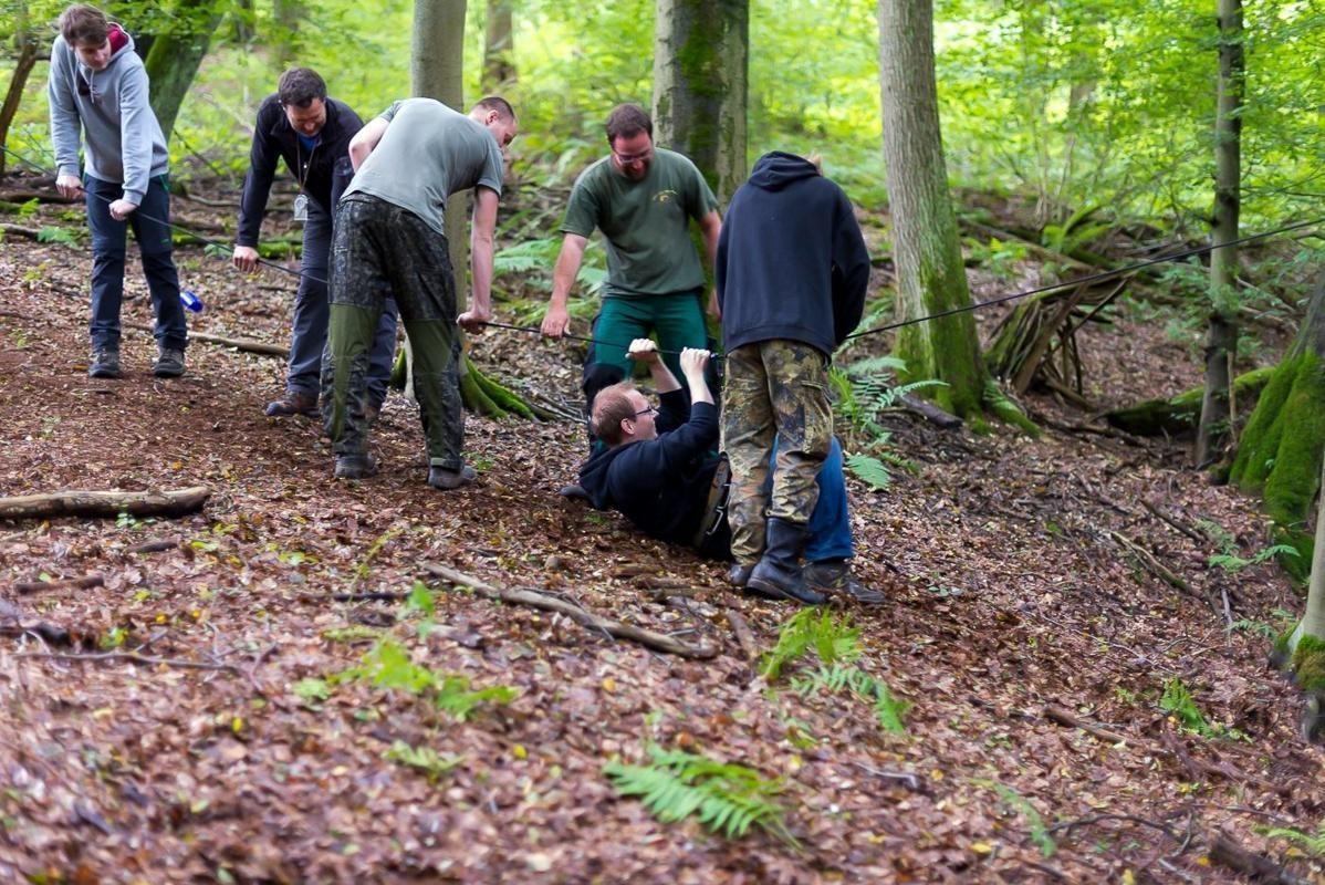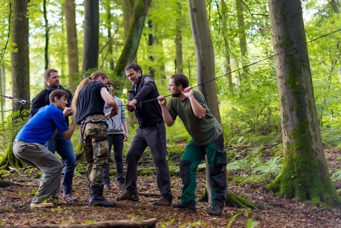 Seilquerung wird von mehreren Personen unterstützt im Wald durchgeführt