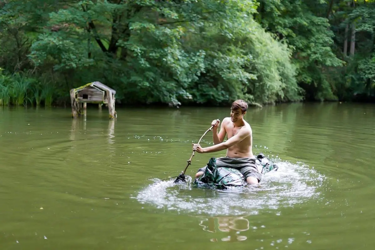 Mann paddelt auf improvisiertem Floß in einem Gewässer