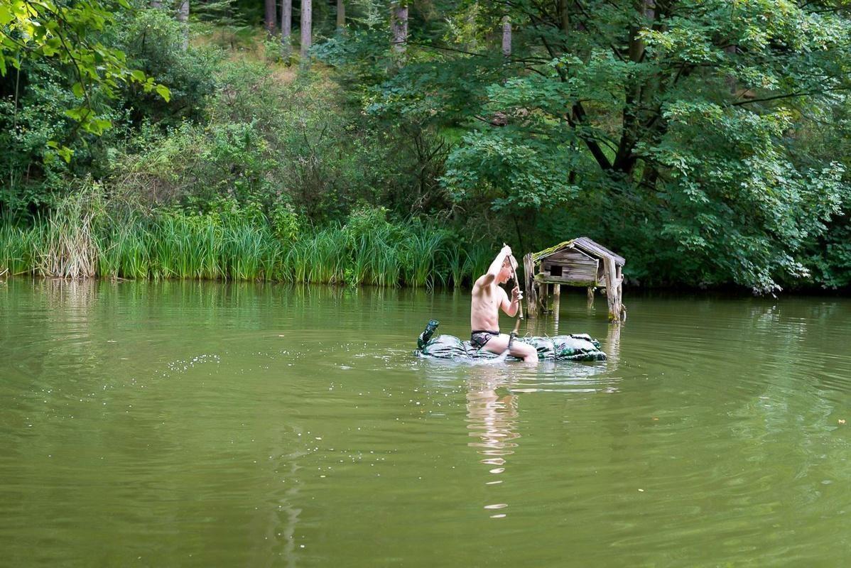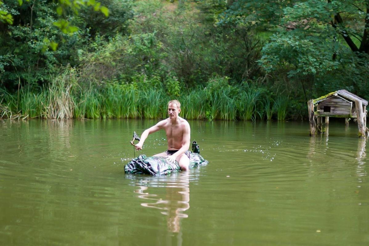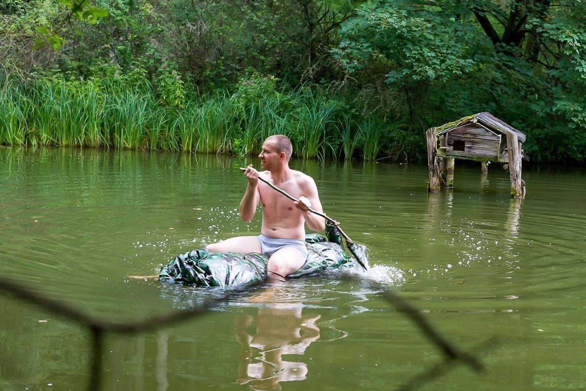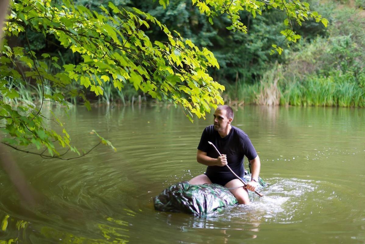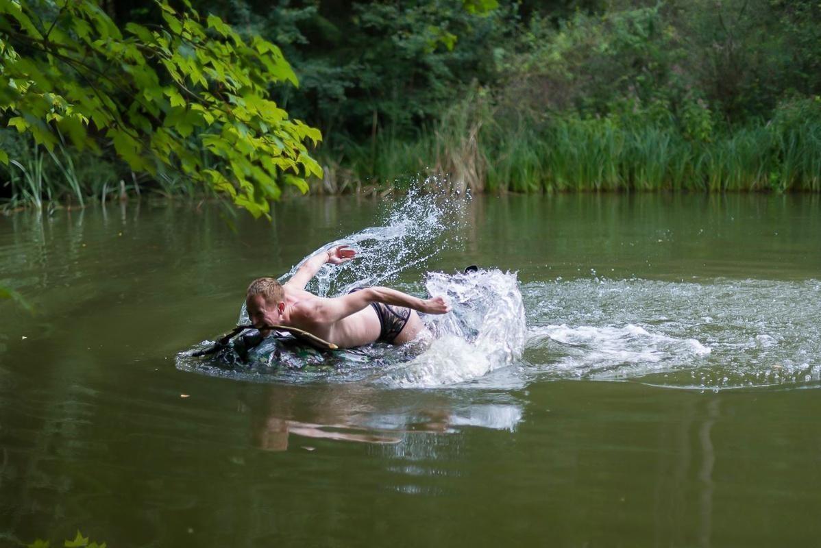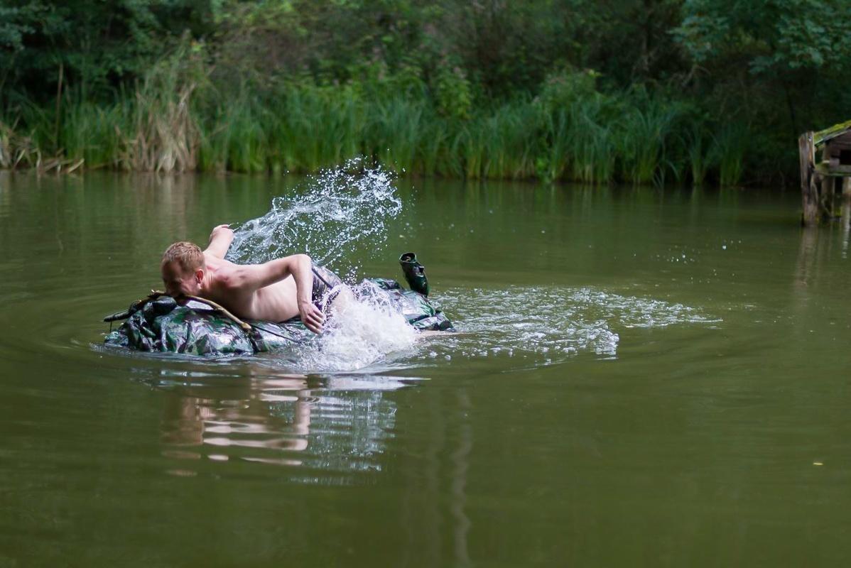 Person paddelt auf einem camouflagefarbenen Schwimmkörper im Wasser