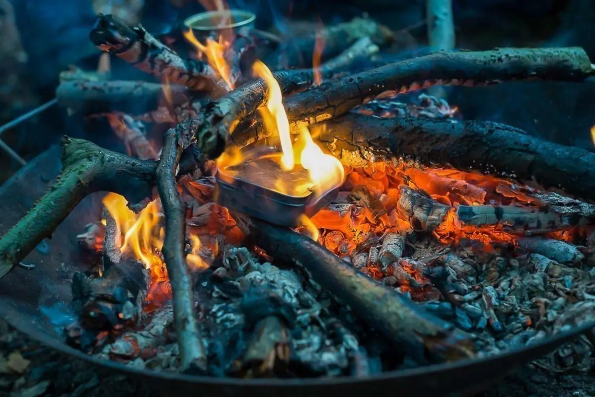 Wasserflasche steht neben brennenden Ästen in einer Feuerstelle