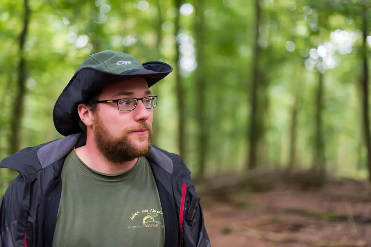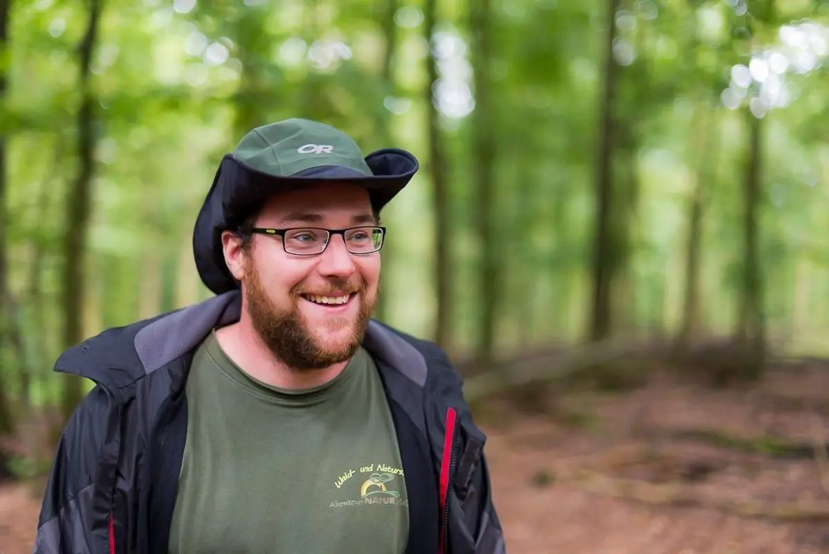 Lächelnder Mann mit Brille und Hut steht im Wald